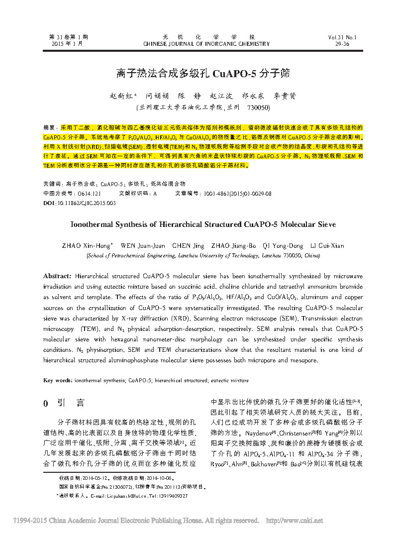 This paper was completed by a researcher at the Institute of Petrochemical Technology of Lanzhou University of Technology to discuss the paper on the synthesis of multi-stage pore CuAPO-5 molecular sieve by ion thermal method, which was published in the important journal .