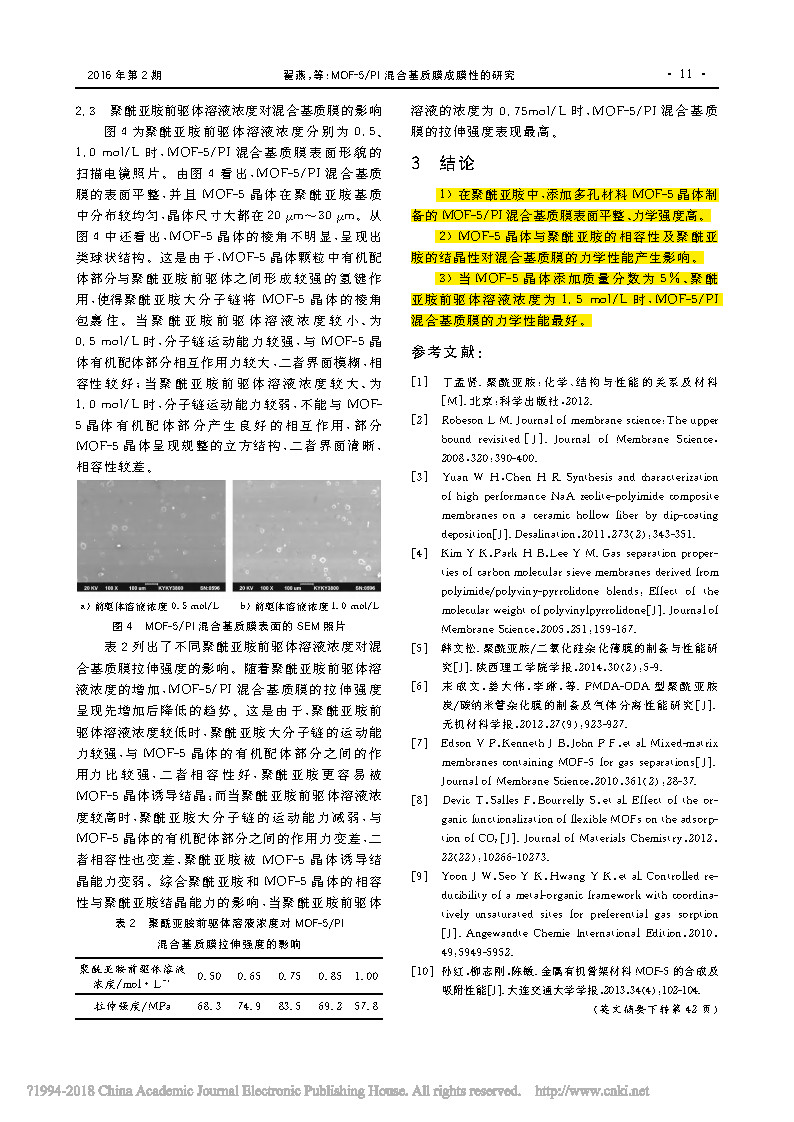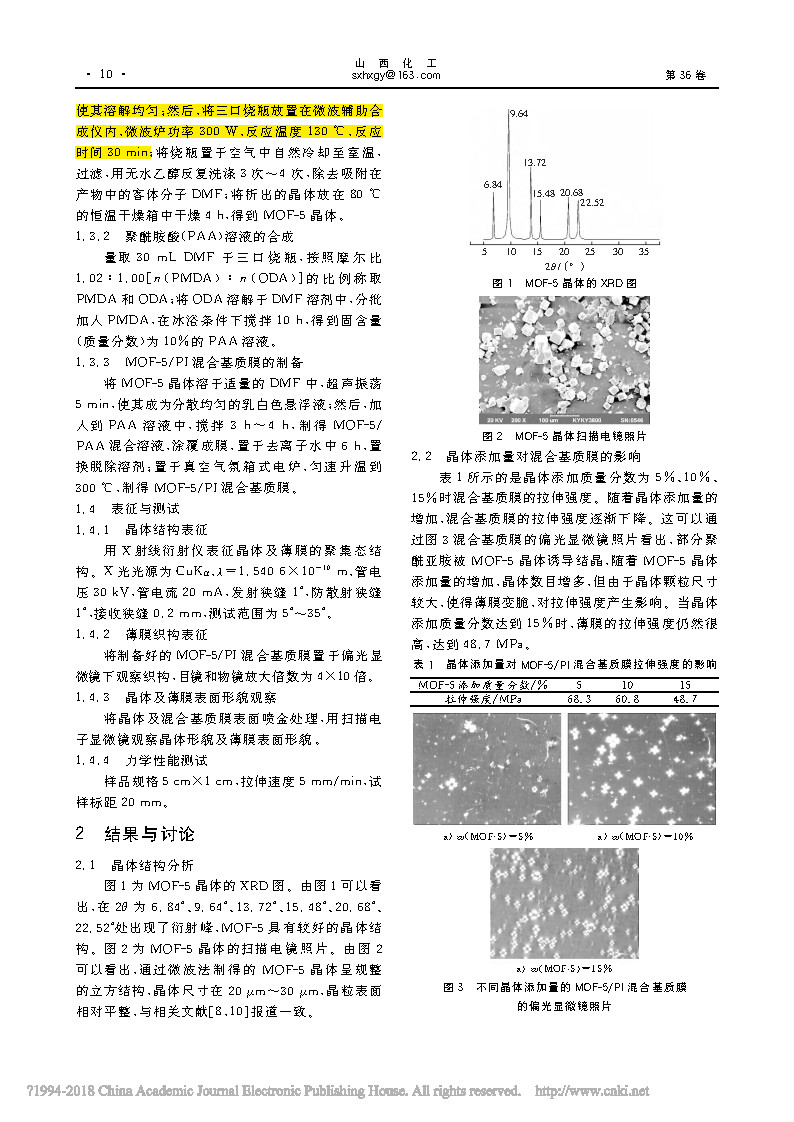 1) In the polyimide, the MOF-5/PI mixed matrix film prepared by adding the porous material MOF-5 crystal has a smooth surface and high mechanical strength. 2) The compatibility of MOF-5 crystal with polyimide and the crystallinity of polyimide have an effect on the mechanical properties of the mixed matrix film. 3) When the mass fraction of MOF-5 crystal is 5% and the concentration of polyimide precursor solution is 1.5 mol/L, the mechanical properties of MOF-5/PI mixed matrix membrane are the best.