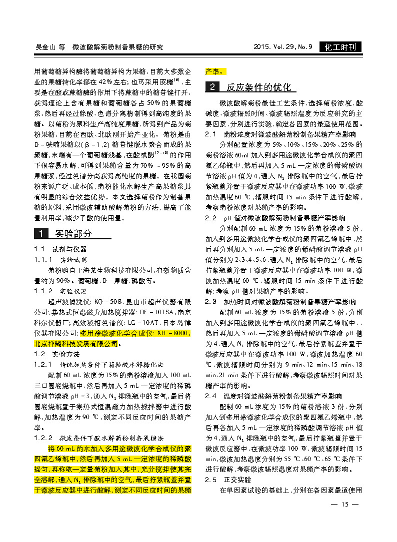 Add 60 mL of water to the PTFE bottle of the multi-purpose microwave chemical synthesizer, then add 5 mL of a certain concentration of dilute phosphoric acid and shake it. Then weigh a certain amount of inulin and add it to stir it completely. The air in the bottle was removed by N2, and the bottle cap was finally tightened and placed in a microwave reactor for acid hydrolysis to determine the fructose yield at different reaction times.