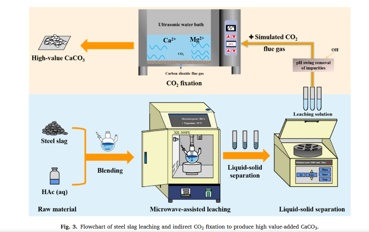 In this manuscript, we describe a steel slag carbonization technique that uses acetic acid (HAc) as the leaching solvent. In addition, we studied in depth the effects of different experimental parameters on the slag leaching process in a microwave environment. It reveals the kinetic mechanism of calcium leaching in steel slag and synthesizes high-value CaCO products by adsorption of low-concentration CO in leachate. The process combines the selective leaching capabilities of HAc with the uniformity and efficiency provided by microwave-enhanced heating. As a result, the calcium and magnesium elements are selectively separated and leached from the steel slag. It solves the challenges of unstable steel slag properties and limited resource utilization, and shows broad development prospects. In addition, the extracted solution can be used for COsequestation and the synthesis of high-purity, high-value carbonate materials. This has greatly contributed to the advancement of CCUS technology in the steel industry, while generating significant social and economic advantages.