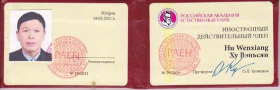 世界著名的俄羅斯自然科學(xué)院(Russian Academy of Natural Sciences)院長(zhǎng)O.L. Kuznetsov,向我國(guó)知名航天軍事醫(yī)學(xué)、有機(jī)藥物化學(xué)與微波化學(xué)科學(xué)家胡文祥教授簽發(fā)俄羅斯自然科學(xué)院外籍院士當(dāng)選證書(shū)。