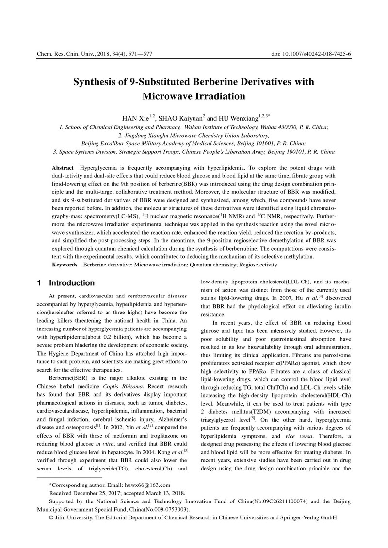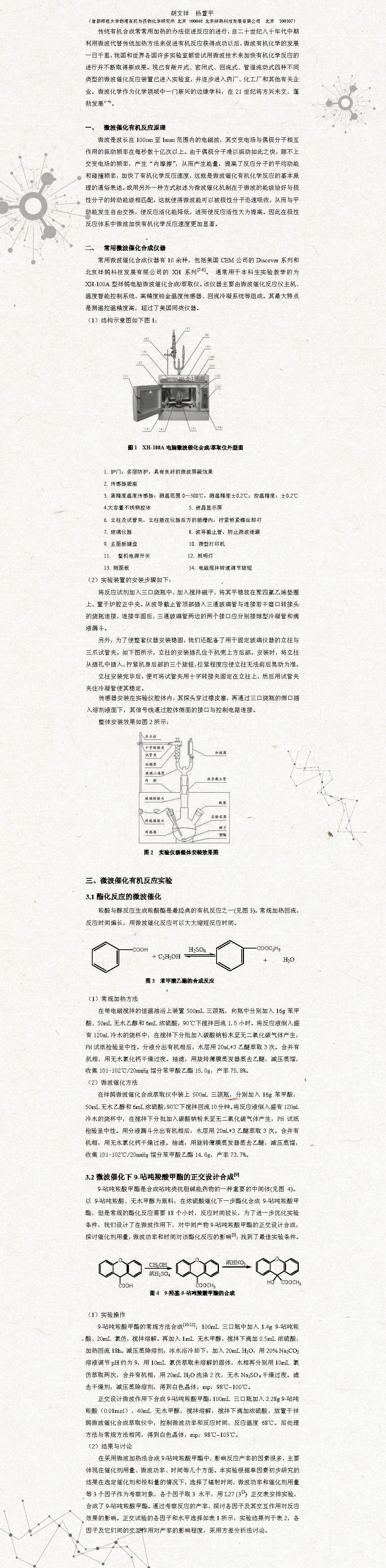 我國有機微波化學(xué)的開拓者、中國工程院院士正式候選人胡文祥教授指導(dǎo)的武漢工程大學(xué)研究生韓謝同學(xué)在北京神劍天軍醫(yī)學(xué)科學(xué)院京東祥鵠微波化學(xué)聯(lián)合實驗室,在邵開元教授的具體指導(dǎo)下,利用祥鵠微波化學(xué)儀器,成功合成了一系列新化合物,取得了良好結(jié)果,其英文論文剛剛發(fā)表在由國際著名的斯普林格出版社出版的高等學(xué)?;瘜W(xué)研究英文版上,收到良好反響!韓謝在攻讀碩士學(xué)位期間,十分努力,發(fā)表學(xué)術(shù)論文10余篇,論文數(shù)量在全校研究生中位居前列。這里作者將其英文論文翻譯成中文,供廣大學(xué)者參考。不妥之處,敬請廣大專家和讀者批評指正!