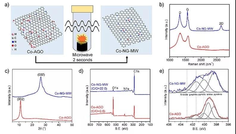 開(kāi)發(fā)具有單分散金屬原子的G-SAMs有效的合成方法,對(duì)于探索它們的基本屬性和潛在應(yīng)用是至關(guān)重要的。本文報(bào)道了一個(gè)方便、快速和一般策略合成一系列嵌入氮摻雜石墨烯中單分散原子過(guò)渡金屬(例如Co,Ni,Cu),用二秒微波加熱胺官能化的氧化石墨烯和金屬鹽的混合物的方法。