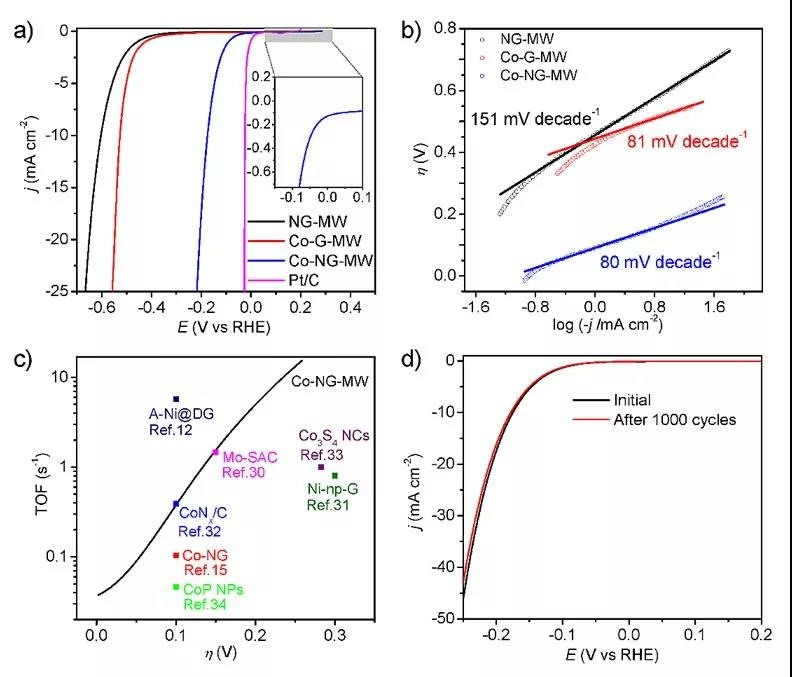 電化學(xué)研究表明:石墨烯負(fù)載的Co原子可以作為高活性電催化劑用于析氫反應(yīng)。 這種微波輔助方法提供了一種快速有效的途徑負(fù)載金屬原子,適用于各種廣泛的應(yīng)用。