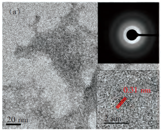(a)微波水熱反應(yīng)45min后制得的Gd3+/CQDs-MH的TEM照片,插圖為電子衍射花樣圖和高分辨率TEM照片