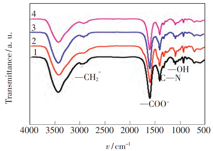 微波水熱反應(yīng)不同時(shí)間制得的Gd3+/CQDs-MH和GdPM的FTIR譜圖(1:GdPM;2~4:15,30,45min)