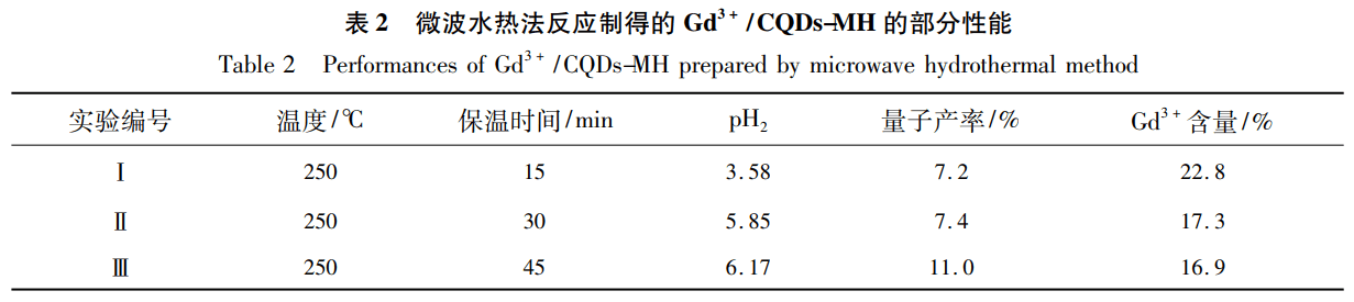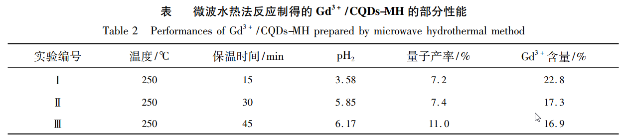 在250℃下,僅經(jīng)歷45min,便可獲得量子產(chǎn)率為11.0%、縱向弛豫率r1高達(dá)4545.3m·L/mol·s的Gd3+/CQDs-MH。而當(dāng)采用管式爐直接加熱GdPM粉末時(shí),只有當(dāng)熱裂解溫度足夠高(如400℃)并保溫2h時(shí),才可獲得量子產(chǎn)率與Gd3+/CQDs-MH相當(dāng)?shù)奶剂孔狱c(diǎn)(12.5%)。