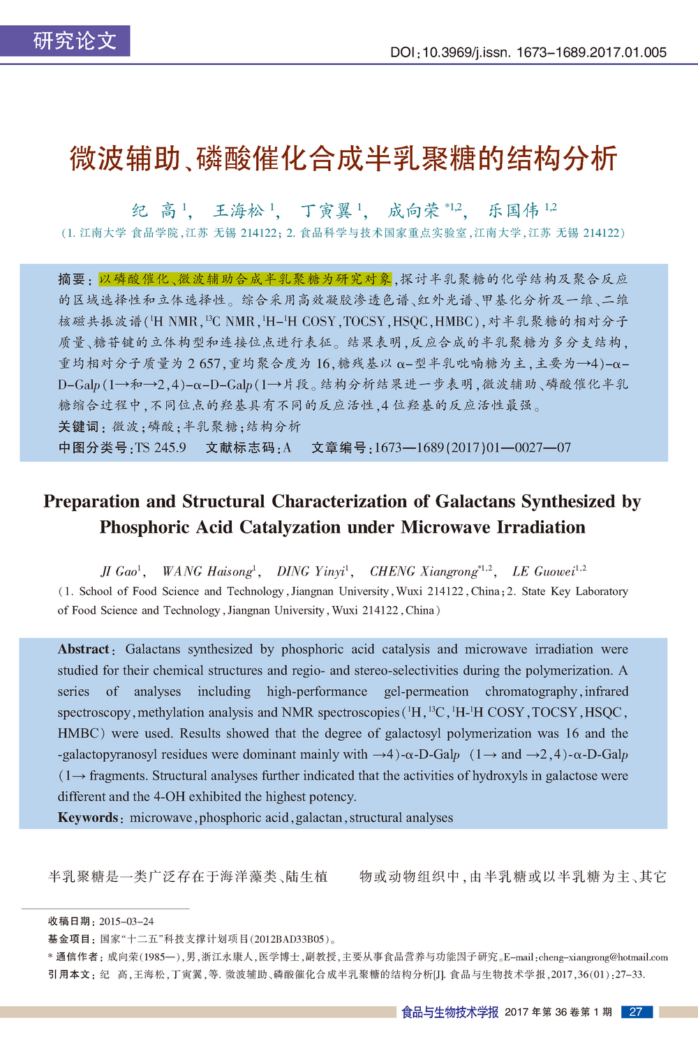 這篇由江南大學(xué)食品學(xué)院的研究學(xué)者完成,討論微波輔助、磷酸催化合成半乳聚糖的結(jié)構(gòu)分析的論文,發(fā)表在重要期刊《食品與生物技術(shù)學(xué)報(bào)》上。