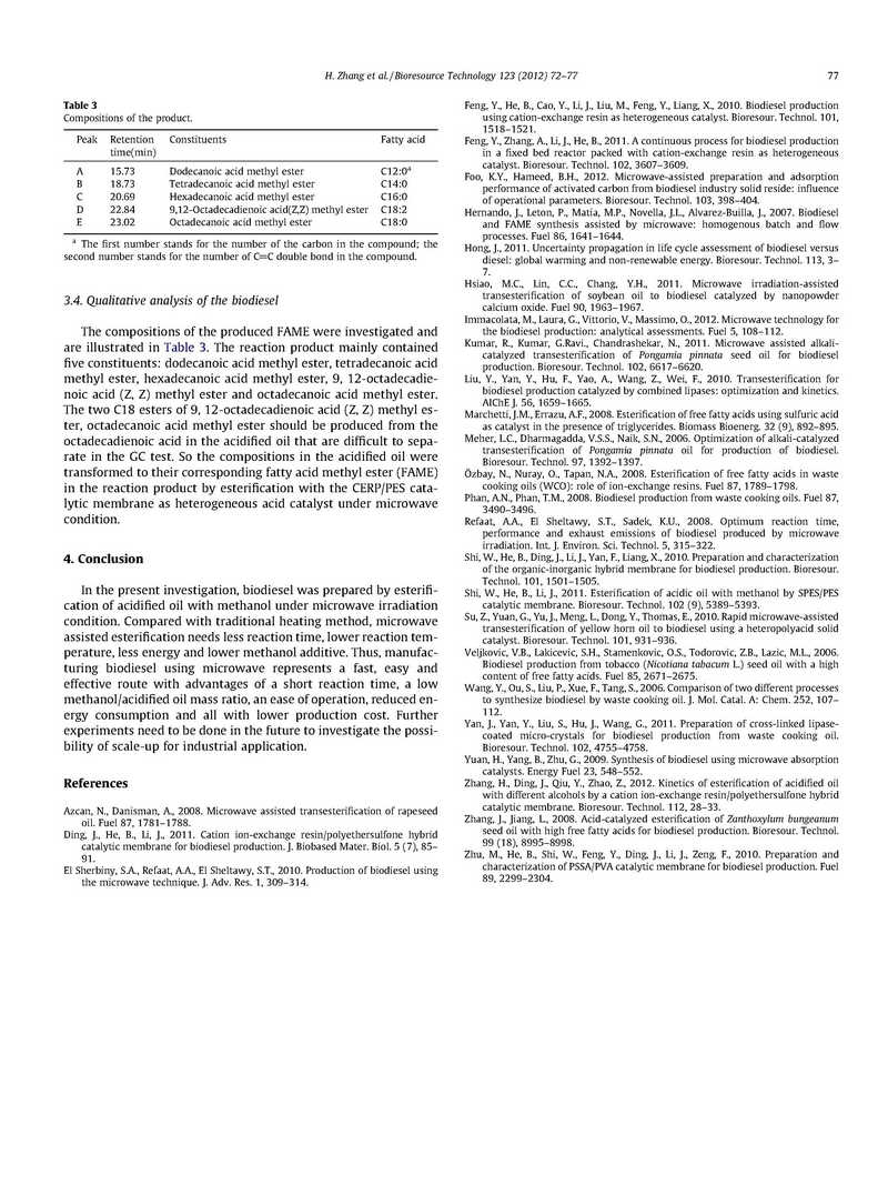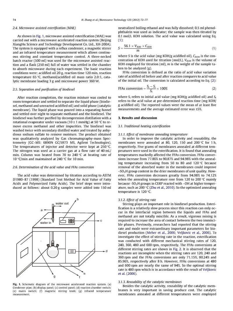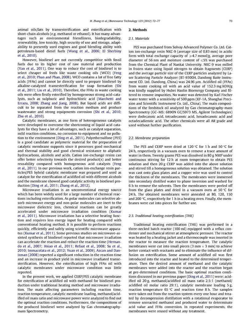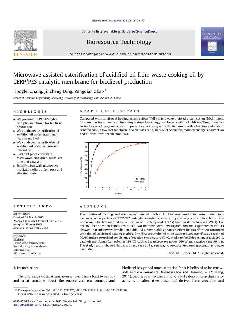 對(duì)傳統(tǒng)的加熱和微波輔助陽(yáng)離子交換樹脂粒子(CERP)/PES催化膜制備生物柴油的方法進(jìn)行了比較研究,得到了利用廢棄食用油中游離脂肪酸(FFAs)的經(jīng)濟(jì)有效方法。