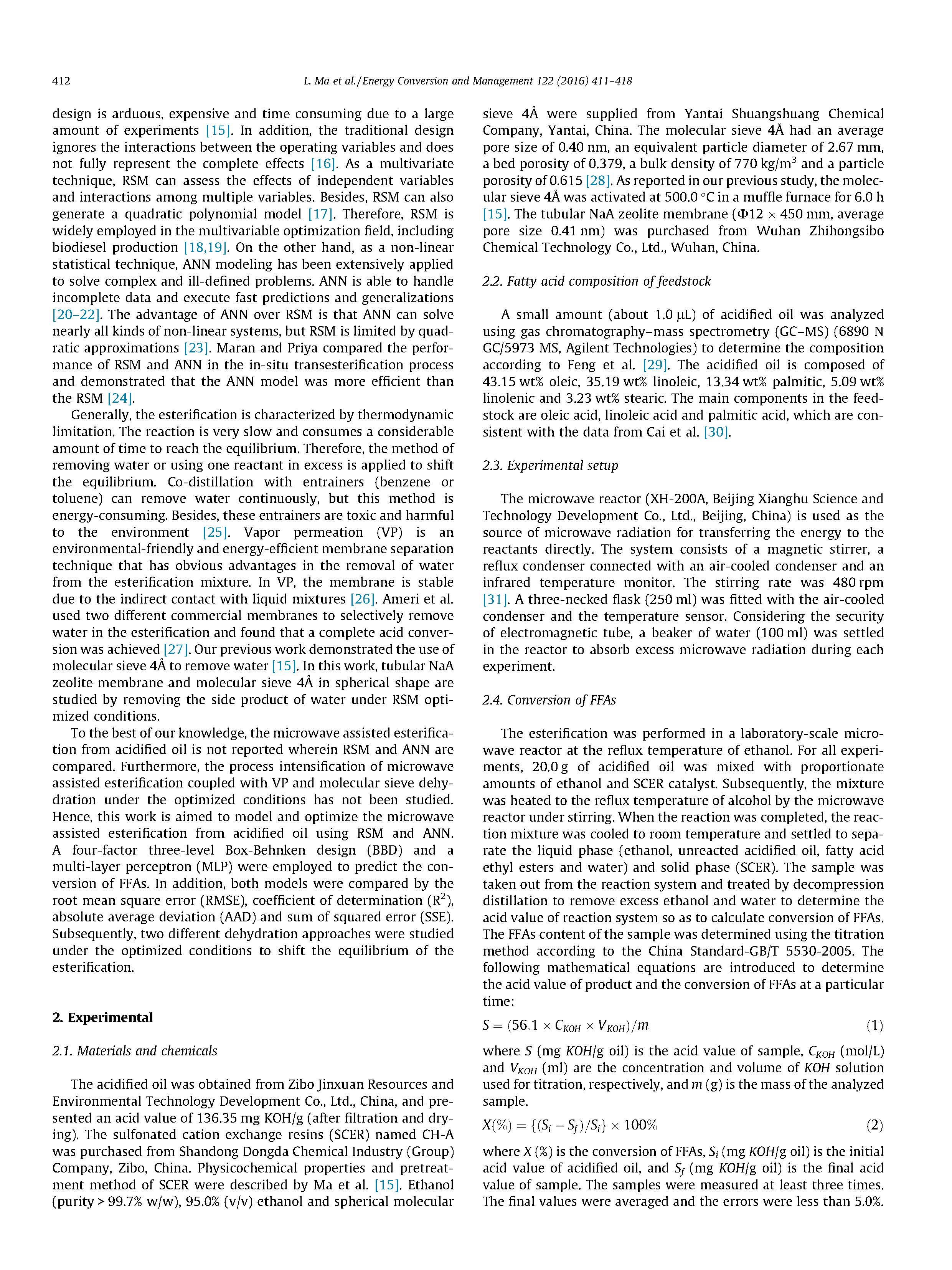 在本研究中,微波輔助酯化反應(yīng)酸化用RSM和ANN對石油進(jìn)行了評價和建模。性能以及基于BBD矩陣的RSM的預(yù)測能力,在統(tǒng)計(jì)學(xué)上對ANN進(jìn)行了比較。基于RMSE的值,R2、AAD和SSE,這兩種模型都能夠預(yù)測實(shí)驗(yàn)數(shù)據(jù),但ANN優(yōu)于BBD。此外,使用管式NAA沸石膜和球形分子篩4%,在RSM優(yōu)化條件下選擇性和連續(xù)地除去水。這兩種脫水方法得到了改進(jìn)FFAs轉(zhuǎn)化率約為20.0%。因此,膜在微波輻射下,VP和原位分子篩脫水是可行的和有效的。