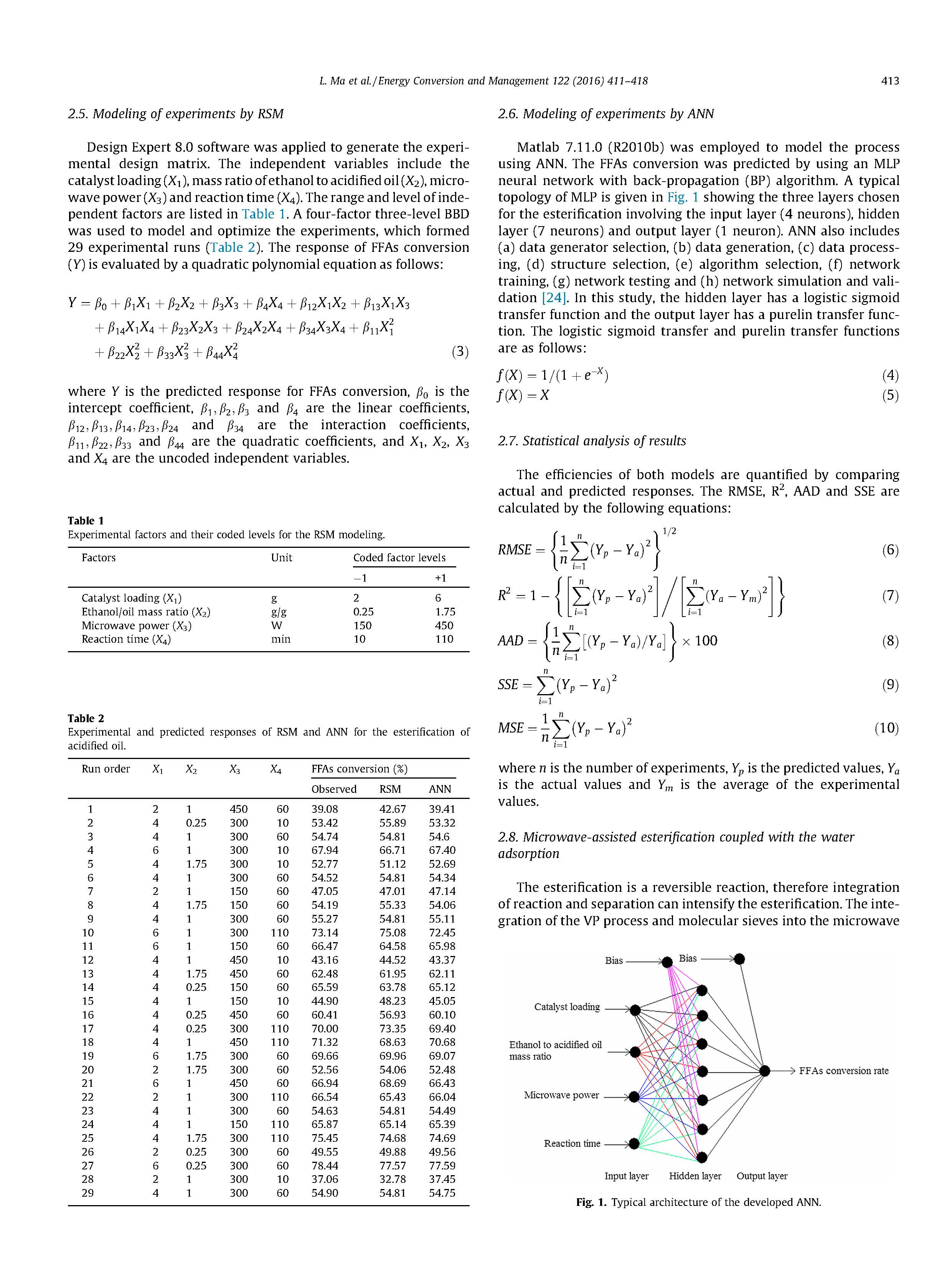 采用響應(yīng)面法(RSM)和人工神經(jīng)網(wǎng)絡(luò)(ANN)對微波輻射下酸化油與乙醇的酯化反應(yīng)進(jìn)行了建模和優(yōu)化。用RSM的Box-Behnken設(shè)計(jì)(BBD)和人工神經(jīng)網(wǎng)絡(luò)的多層感知器(MLP)評價了乙醇與酸化油的質(zhì)量比、催化劑的負(fù)載量、微波功率和反應(yīng)時間對反應(yīng)的影響。