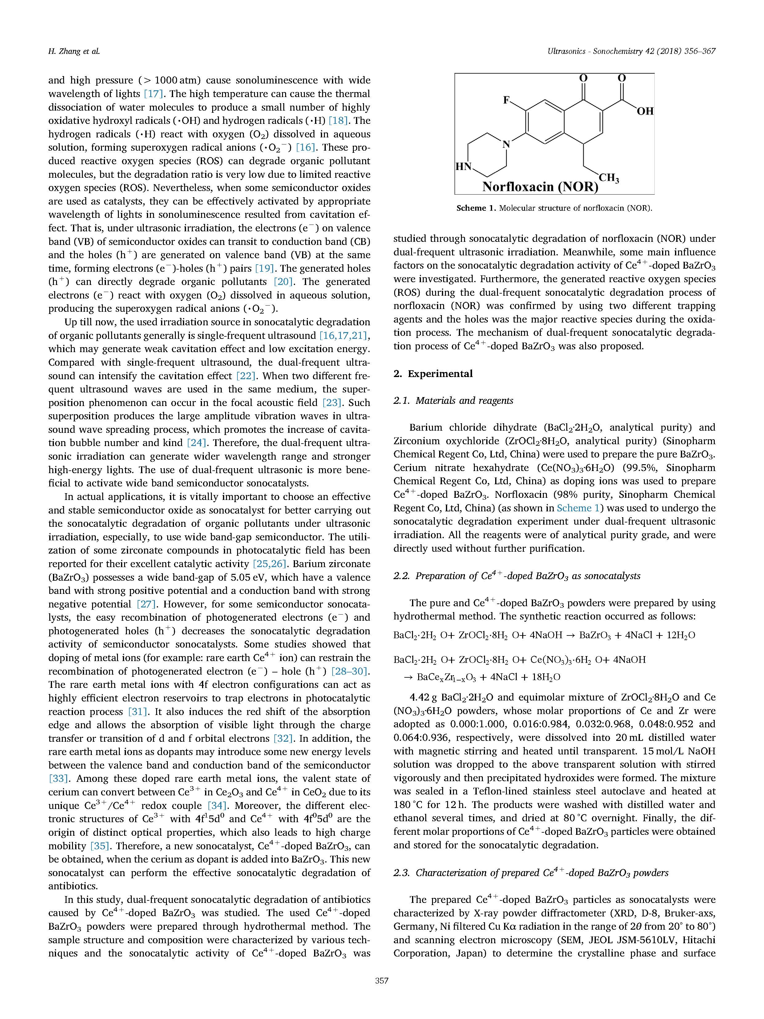 最后,提出了Ce4摻雜BaZrO 3引起諾氟沙星(NOR)雙頻催化降解的可能機(jī)制。實(shí)驗(yàn)結(jié)果表明,Ce4摻雜的BaZrO 3在雙頻超聲輻照下具有良好的超聲催化活性。在最佳條件下,雙頻超聲照射150 min可去除大部分諾氟沙星(NOR)。