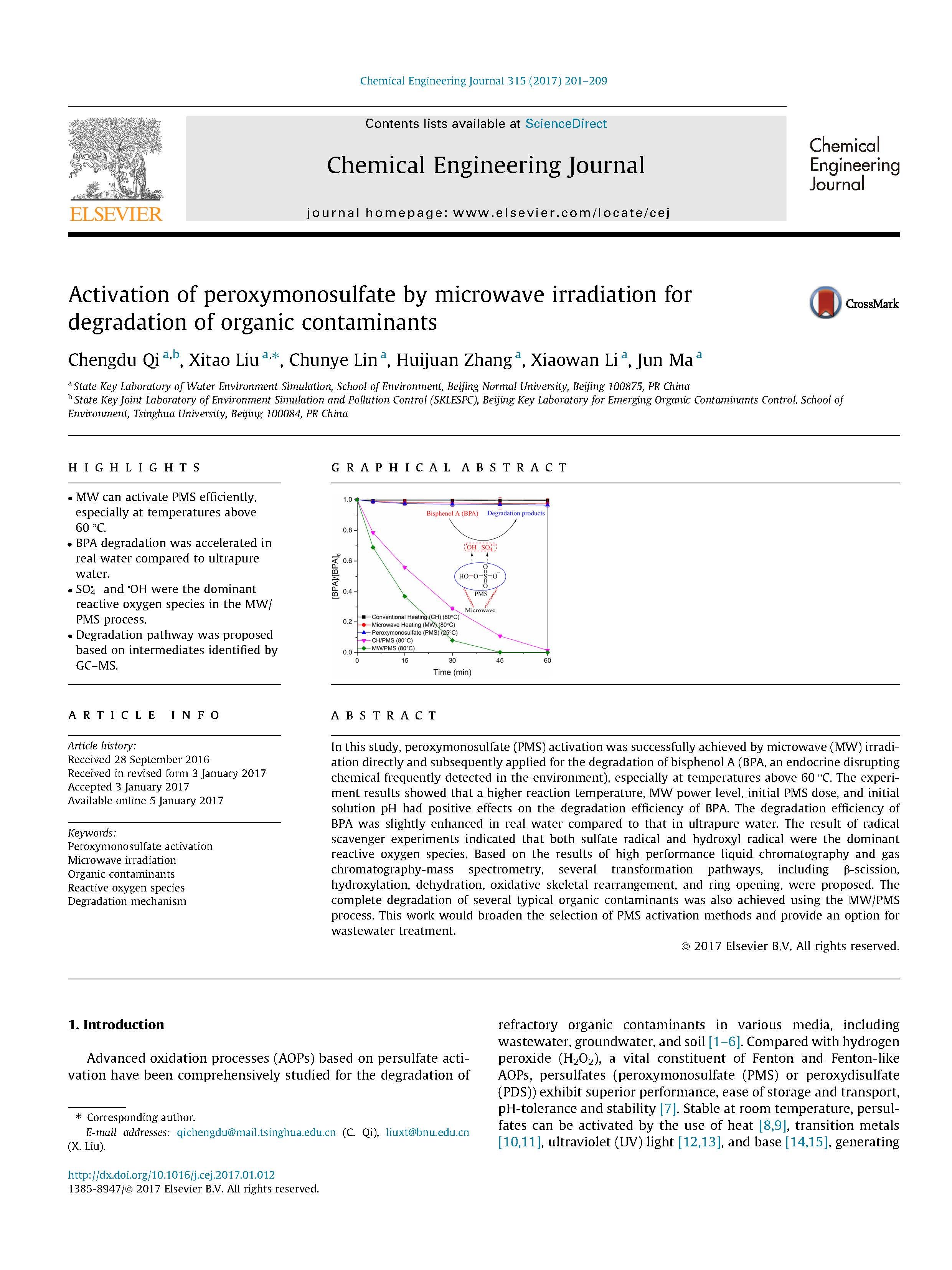這篇由北京師范大學等的研究學者完成,討論通過微波輻射活化過氧單硫酸鹽以降解有機污染物的論文,發(fā)表在一區(qū)重要期刊《Chemical Engineering Journal》,影響因子:6.735。