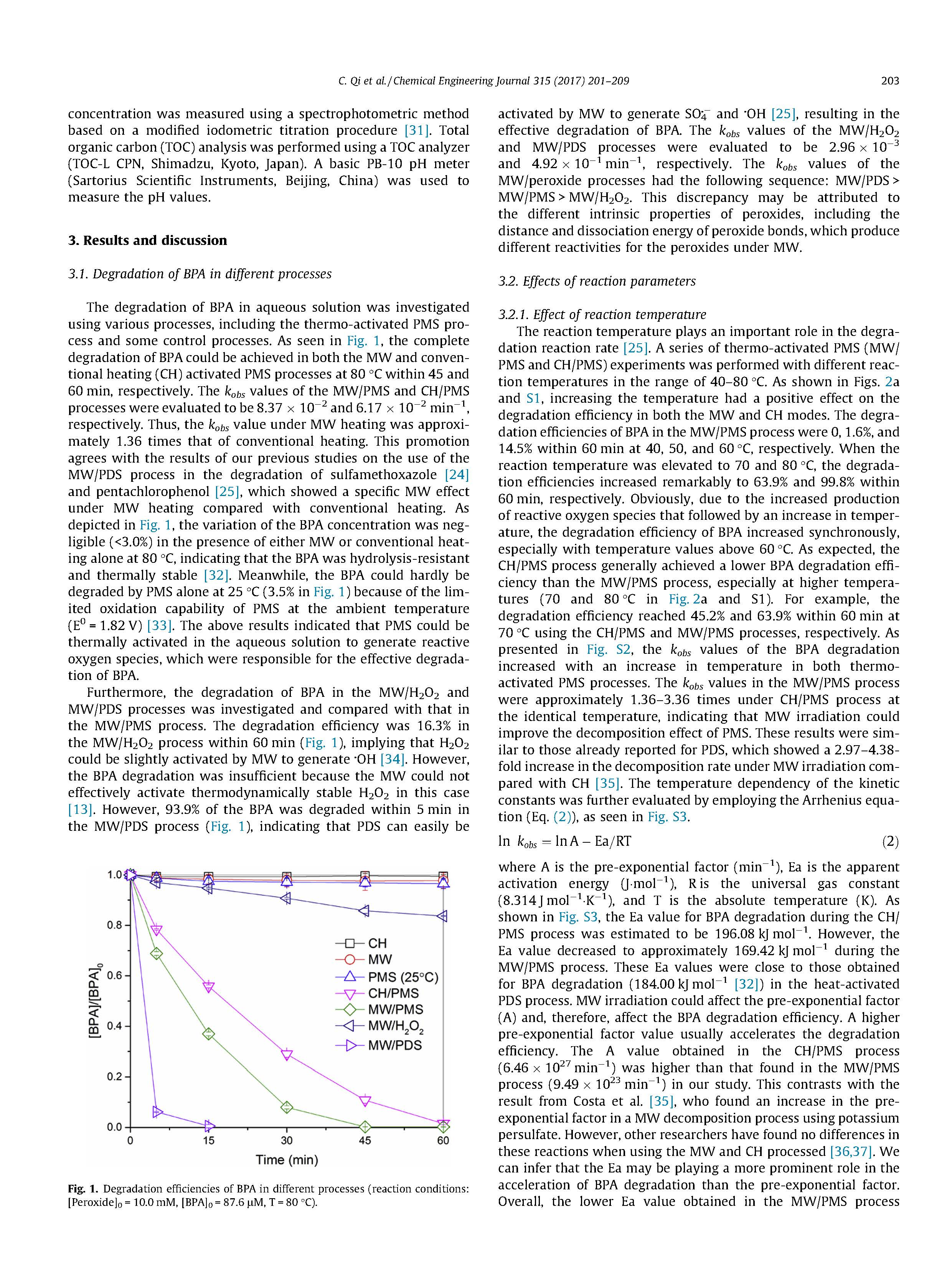 總之,驗證了MW輻照以直接實現(xiàn)PMS活化,以降解BPA,特別是在溫度下above60C.BPA的降解效率和假一級降解速率常數(shù)均隨溫度升高而增加。反應溫度升高,MW功率,初始PMS濃度和初始溶液pH值。降解效率在實際水中BPA顯著增強(BW和TW)。硫酸根和羥基是MW/PMS過程中產(chǎn)生的主要活性氧物質(zhì)。此外,鑒定了BPA的降解中間體,并提出了幾種轉(zhuǎn)化途徑。一定程度觀察到TOC去除和PMS的高消耗。MW/PMS流程。此外,在MW/PMS中實現(xiàn)了幾種典型有機污染物的完全降解。工藝。因此,MW/PMS流程提供了一個選項,是一種有前途的廢水處理技術(shù)。