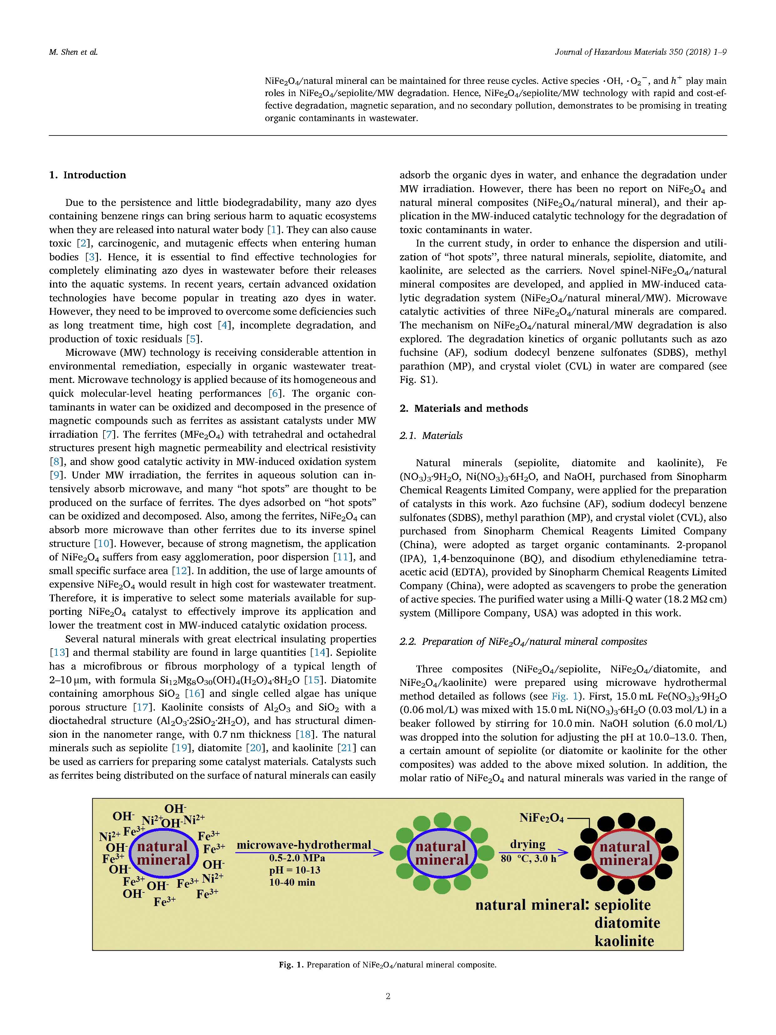 本研究采用微波水熱法制備了尖晶石-NiFe2O4/天然礦物(海泡石、硅藻土和高嶺石)復(fù)合材料,并將其應(yīng)用于十二烷基苯磺酸鈉(SDBs)、偶氮胂(AF)、甲基對(duì)硫磷(MP)等有機(jī)污染物的微波催化降解(NiFe2O4/天然礦物/mw)中,以及溶液中的結(jié)晶紫(CVL)。