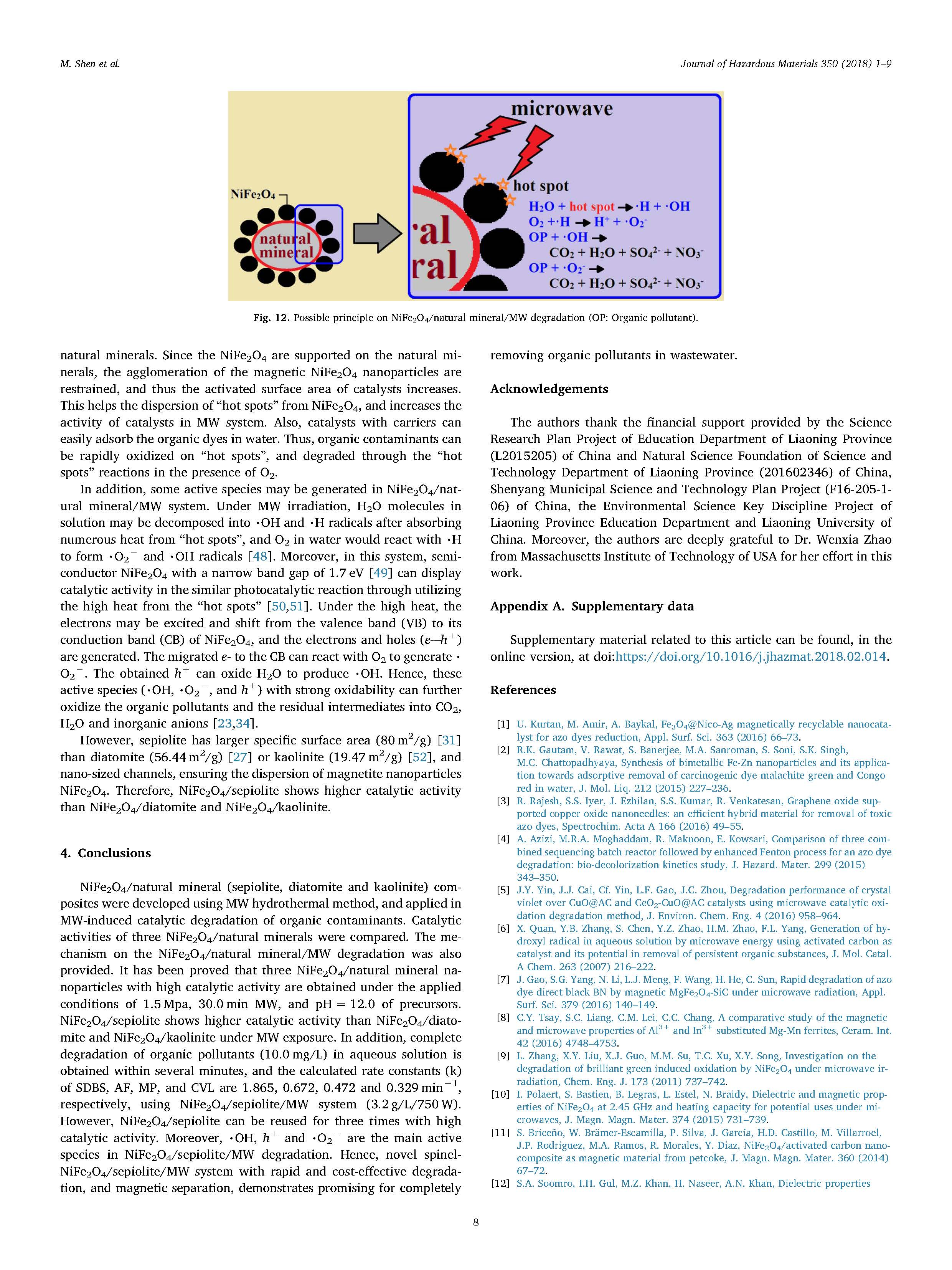 比較了三種NiFe2O4/天然礦物復(fù)合材料的催化活性,考察了原料合成工藝參數(shù)如NiFe2O4與天然礦物的摩爾比、催化劑前驅(qū)體溶液的pH值、微波輻射時(shí)間和催化劑重復(fù)使用周期等降解參數(shù)對(duì)催化劑性能的影響。給出了NiFe2O4/天然礦物/MW降解的原理。結(jié)果表明,NiFe2O4/天然礦物/MW可在幾分鐘內(nèi)完全去除廢水中的有機(jī)污染物。NiFe2O4/海泡石具有較高的催化活性。在NiFe2O4/海泡石/MW體系中,SDBS、AF、MP和CVL的降解速率常數(shù)分別為1.865、0.672、0.472和0.329 min-1。NiFe2O4/天然礦物的性能可維持三次循環(huán)。活性物種 %OH, %O2-和h+對(duì)NiFe2O4/海泡石/MW的降解起主要作用。