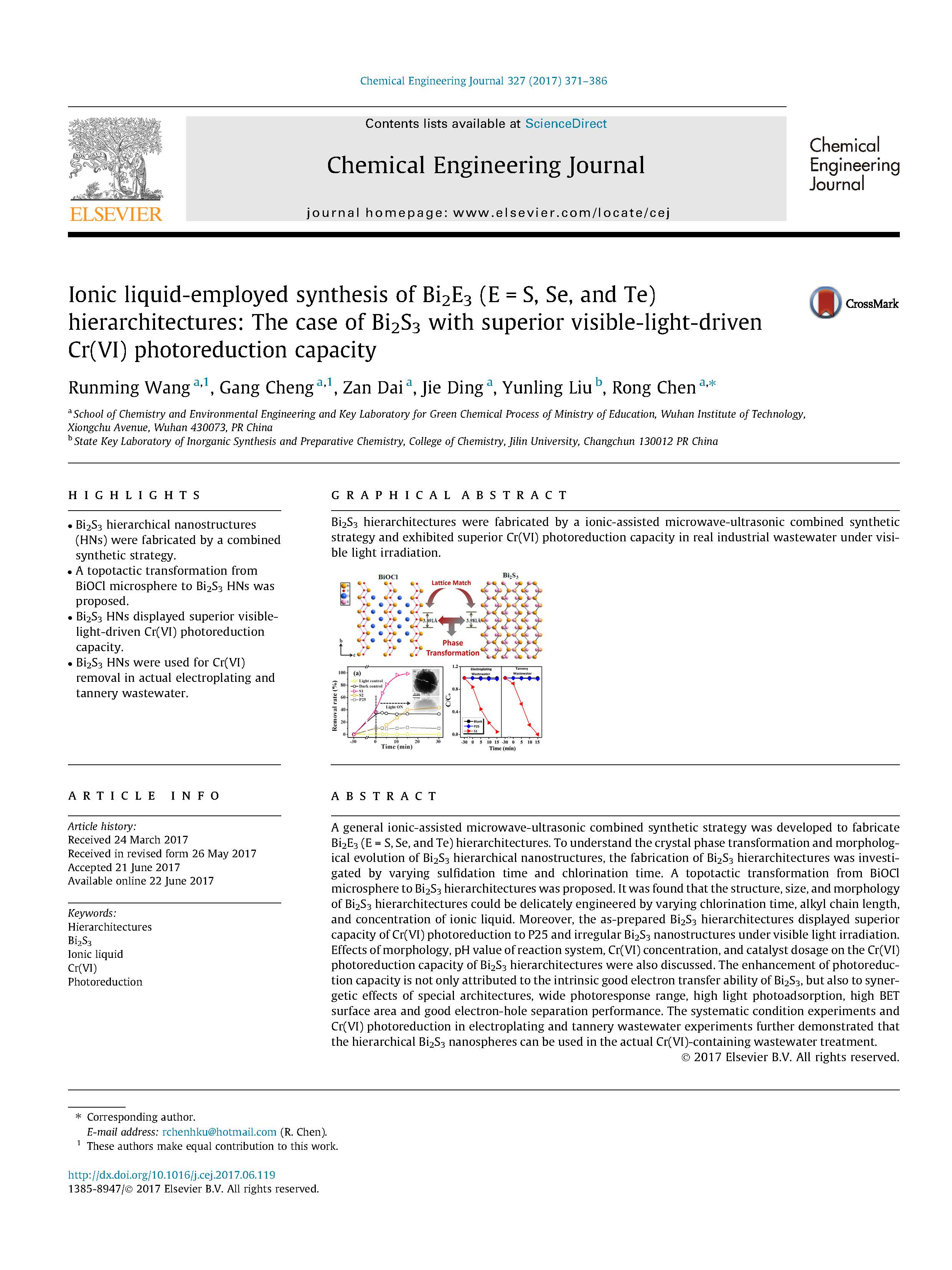 總之,采用離子輔助和微波超聲相結(jié)合的方法成功地合成了Bi2E3(E=S,Se,Te)結(jié)構(gòu)。用XRD、Raman、XPS、SEM、TEM等手段對(duì)BiOCl微球中Bi2S3的相轉(zhuǎn)變和結(jié)構(gòu)演化進(jìn)行了詳細(xì)的研究。通過(guò)改變氯化時(shí)間、烷基鏈長(zhǎng)度和離子液體濃度,實(shí)現(xiàn)了Bi2S3體系的結(jié)構(gòu)、尺寸和形貌裁剪。光催化研究表明,反應(yīng)體系的pH值、Cr(VI)濃度和催化劑用量對(duì)Bi2S3體系的Cr(VI)光還原能力有顯著影響。與P25、BiOCl和不規(guī)則Bi2S3納米結(jié)構(gòu)相比,所合成的Bi2S3納米結(jié)構(gòu)具有更好的Cr(VI)光還原能力,這主要?dú)w因于其固有的良好的電子轉(zhuǎn)移能力、較高的比表面積來(lái)吸附更多的染料分子以及具有良好的光散射能力,從而提高了捕光效率,提高了充電器的轉(zhuǎn)移能力。以其良好的光催化活性和可循環(huán)利用性為基礎(chǔ),認(rèn)為所制備的Bi2S3層狀結(jié)構(gòu)具有良好的光催化性能,有望成為還原Cr(VI)的潛在光催化劑。更重要的是,Bi2S3分級(jí)納米結(jié)構(gòu)在實(shí)際電鍍和制革工業(yè)廢水處理中顯示出優(yōu)良的Cr(VI)光還原能力和快速的光還原速率。這項(xiàng)工作將證明進(jìn)一步探索具有高潛在危險(xiǎn)的Cr(VI)光還原廢水的層次納米結(jié)構(gòu)。