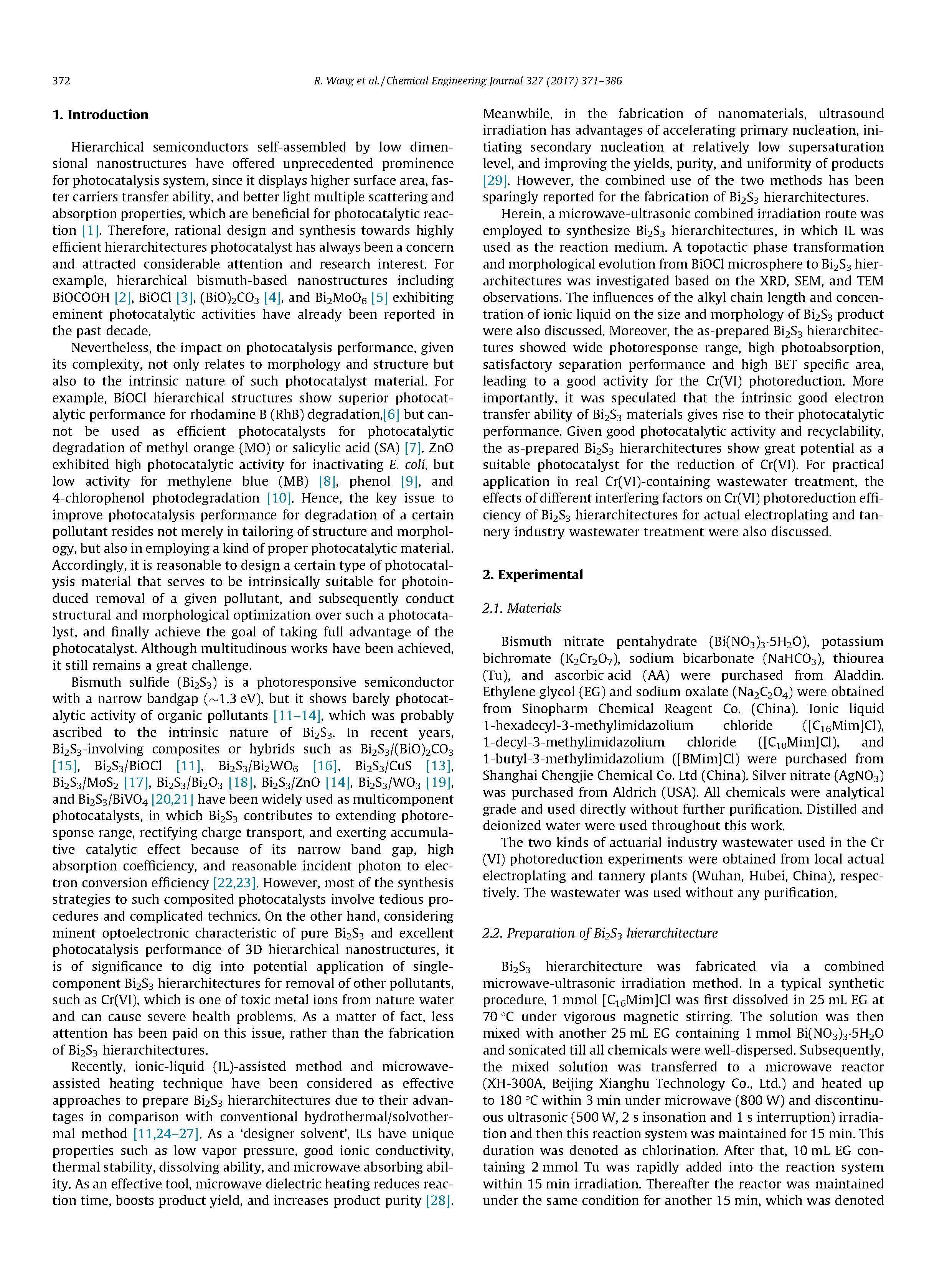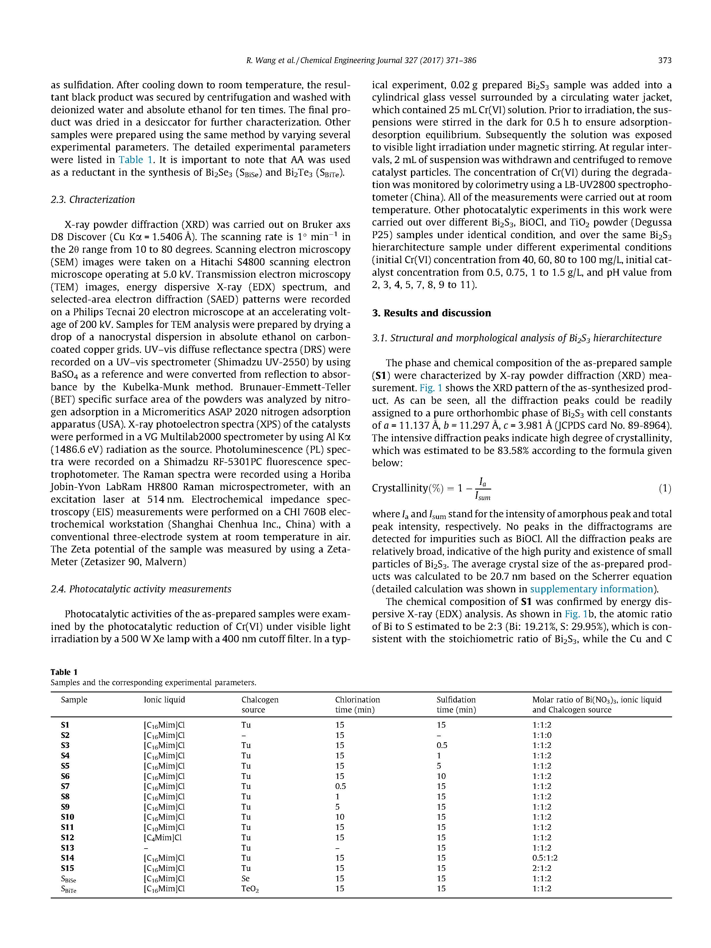 采用微波-超聲聯(lián)合輻照法制備了Bi2S3級(jí)結(jié)構(gòu)。在一個(gè)典型的合成過(guò)程中,1 mmol[C16Mim]Cl首先在25 mL EG中70℃溶解,C在強(qiáng)磁攪拌下溶解。然后將該溶液與含有1 mmol Bi(NO3)35H2O的25 mL EG混合,并進(jìn)行超聲處理,直至所有的化學(xué)物質(zhì)都能很好地分散。隨后,將混合溶液轉(zhuǎn)移到微波反應(yīng)器(北京祥鵠科技有限公司XH-300A)。在微波(800 W)和間斷超聲(500 W,2 s,1 s中斷)的作用下,在180℃內(nèi)加熱3 min,使反應(yīng)體系保持15 min。這個(gè)持續(xù)時(shí)間被表示為氯化。在此基礎(chǔ)上,在15 min內(nèi)將含2 mmol Tu的10 mL EG快速加入到反應(yīng)體系中。此后,反應(yīng)堆又在相同的條件下維持了15分鐘,即372 R.Wang等人。/化學(xué)工程學(xué)報(bào)327(2017)371-386 AS硫化。冷卻至室溫后,用離心法固定黑產(chǎn)品,用去離子水和無(wú)水乙醇清洗10次。最終產(chǎn)品在干燥器中干燥,以便進(jìn)一步表征。其他樣品采用相同的方法,通過(guò)改變幾個(gè)實(shí)驗(yàn)參數(shù)來(lái)制備。詳細(xì)的實(shí)驗(yàn)參數(shù)列于表1。值得注意的是,AA在合成Bi2Se3(SBiSe)和Bi2Te3(SBiTe)中被用作還原劑。