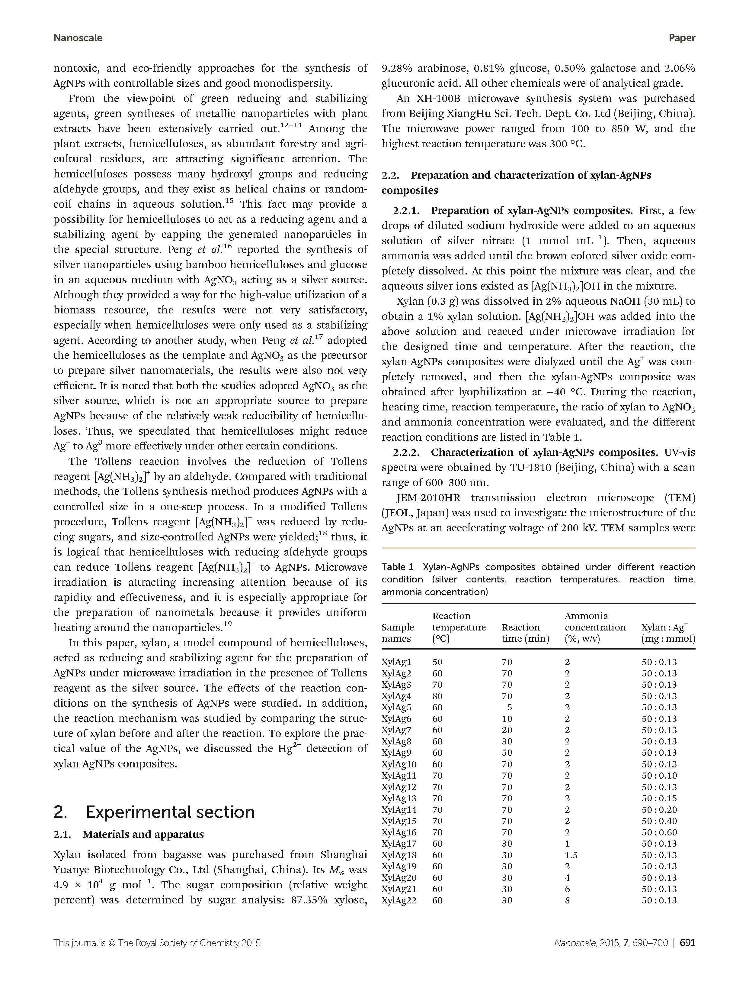 本文報(bào)告了一種簡便、綠色的制備高穩(wěn)定均勻分布的銀納米粒子(AgNPs)的方法,在微波輻射下,以生物高分子木聚糖為穩(wěn)定還原劑,通過托倫反應(yīng)制備了高穩(wěn)定均勻分布的銀納米粒子(AgNPs)。為了優(yōu)化反應(yīng)條件,對不同的反應(yīng)變量進(jìn)行了評價(jià)。