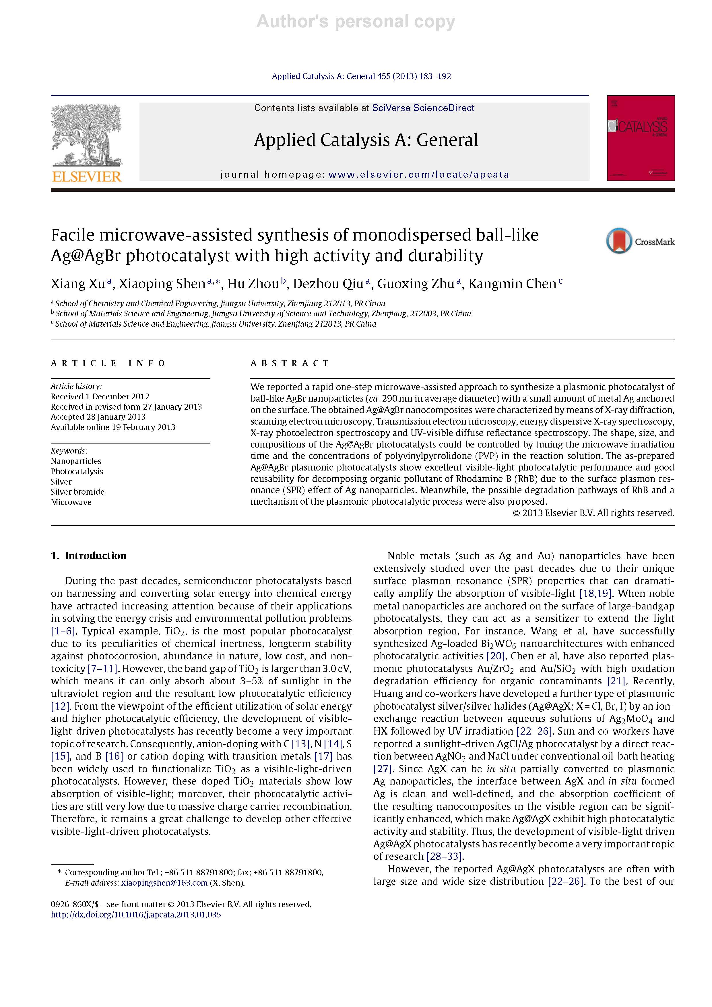 這篇由中國(guó)海洋大學(xué)等的研究學(xué)者完成,討論簡(jiǎn)單的微波輔助合成單分散球狀A(yù)g @ AgBr光催化劑,具有高活性和耐久性的論文,發(fā)表在二區(qū)重要期刊《Applied Catalysis A: General》,影響因子:4.521。