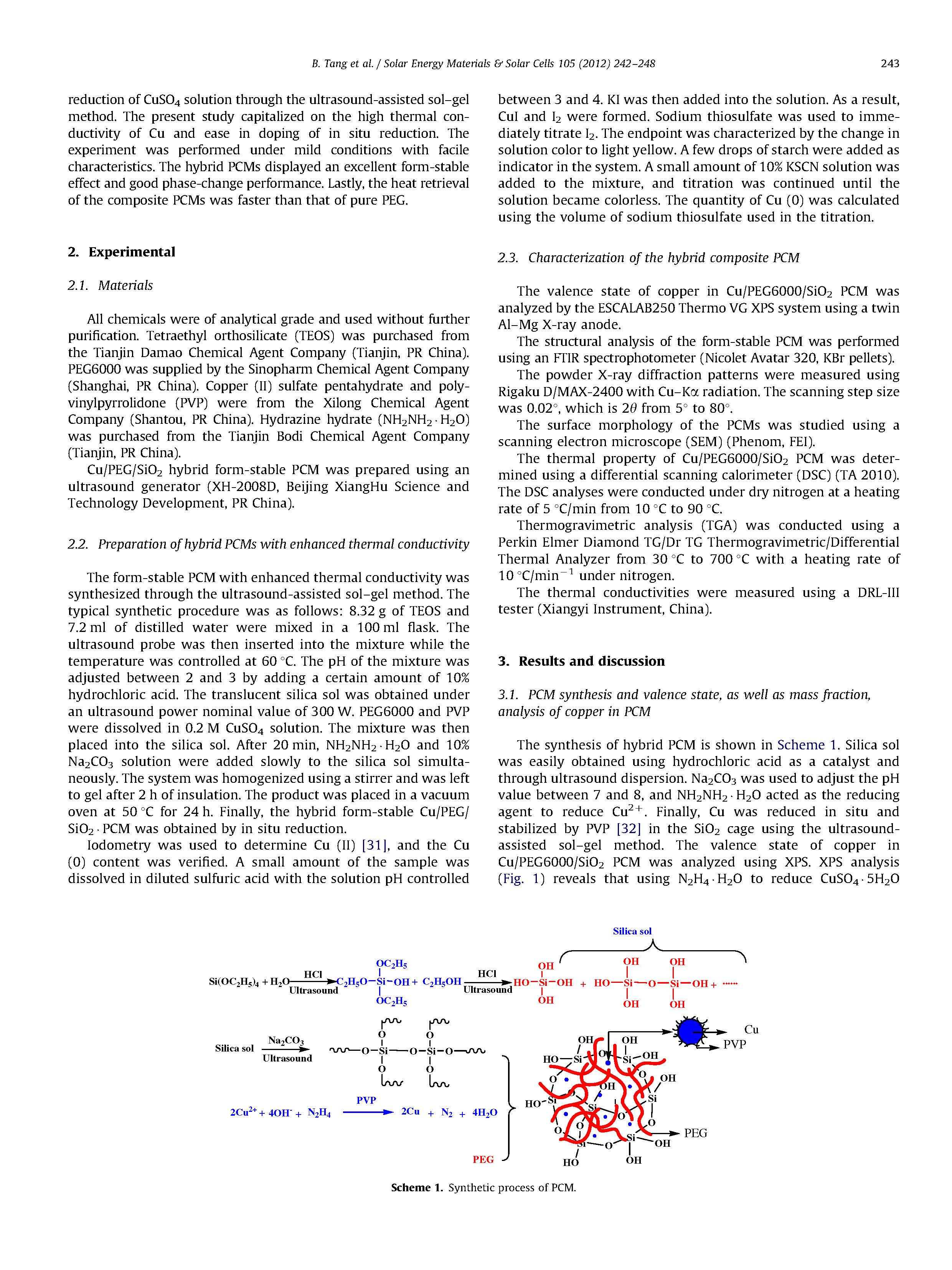 為了提高熱充放電過程中的能量利用效率,通過超聲輔助溶膠-凝膠法原位化學還原CuSO 4,通過原位Cu摻雜,提高了聚乙二醇(PEG)/SiO 2雜化形成穩(wěn)定相變材料(PCM)的熱導率。該方法具有制備條件溫和的特點,為開發(fā)具有高導熱性能的新型雜化型穩(wěn)定PCM提供了一條重要途徑。