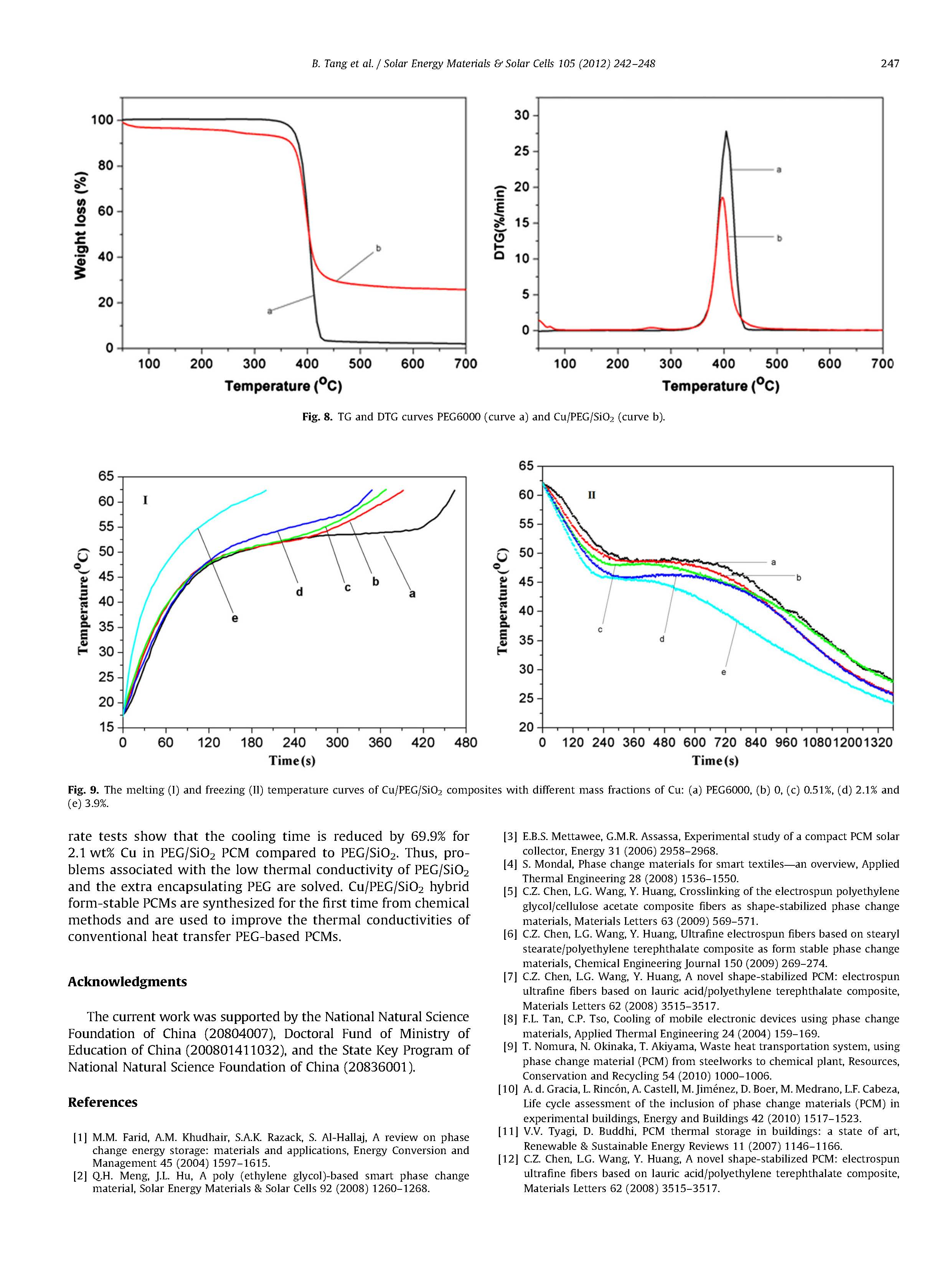 Cu/PEG/SiO 2 PCM的相變焓高達110 J/g,2.1wt%Cu在PEG/SiO 2中的熱導率為0.414 W/(MK),比純PEG提高了38.1%。Cu/PEG/SiO 2雜化材料具有良好的熱穩(wěn)定性和良好的形態(tài)穩(wěn)定性。