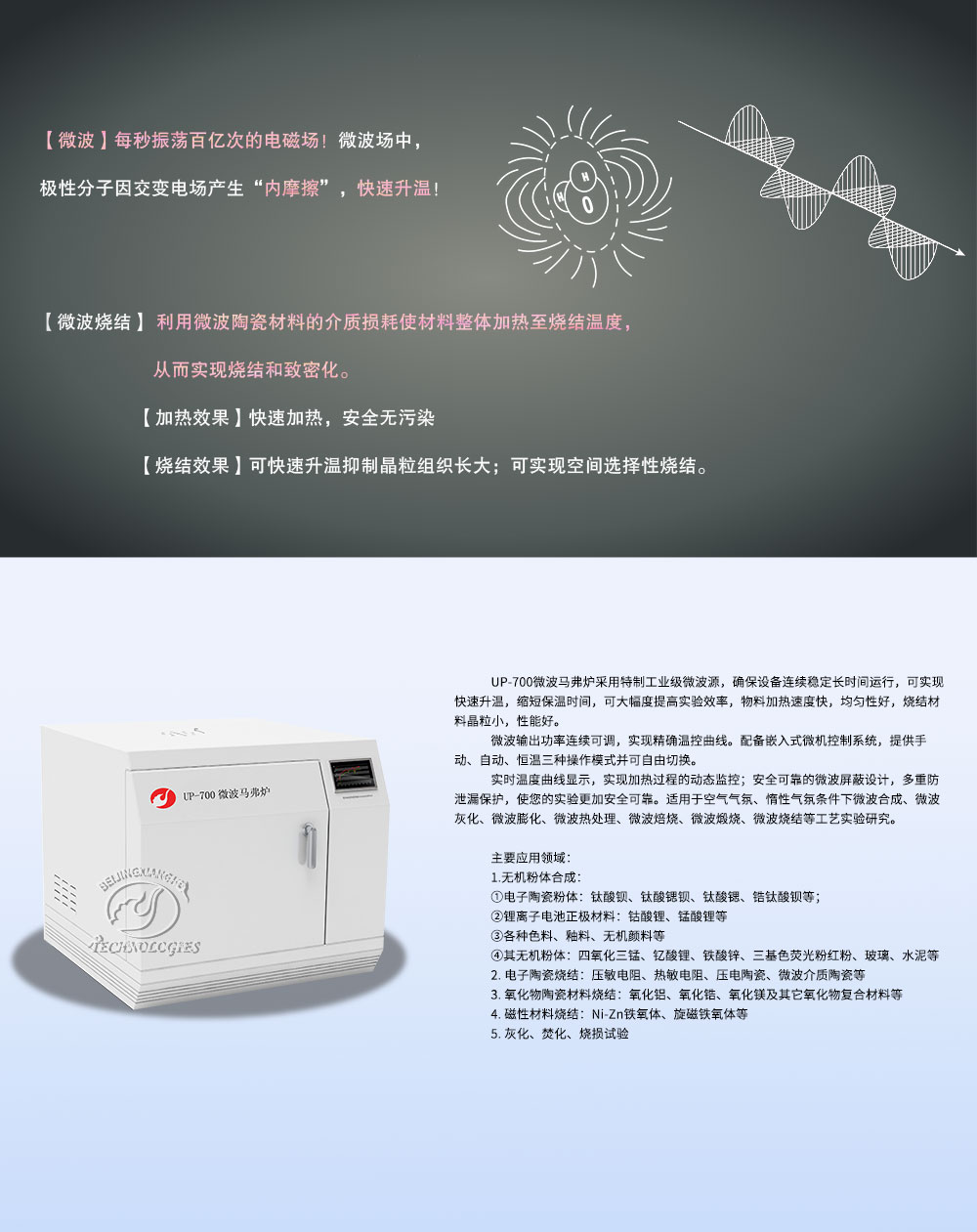 UP-700微波馬弗爐采用特制工業(yè)級微波源,確保設備連續(xù)穩(wěn)定長時間運行,可實現超快速升溫,并大幅縮短保溫時間,實驗效率成倍提高。微波輸出功率無級可調,實現精確溫控曲線。采用進口高精度紅外測溫儀,直接測量樣品溫度。配備嵌入式微機控制系統(tǒng),提供手動、自動、恒溫三種操作模式并可自由切換。各種獨創(chuàng)的專用坩堝和保溫結構供選擇,對物料無污染,可加工處理各種微波特性不同的物料,通用性好,設置耐腐蝕排氣通道,可快速排出加熱過程中產生的氣體。觸摸屏顯示和操作,配備WINDOWS 操作系統(tǒng),可接PC機;可設置和存儲多條溫控曲線,運行記錄自動存儲,兼容打印機,實時溫度曲線顯示,實現加熱過程的動態(tài)監(jiān)控,安全可靠的微波屏蔽設計,多重防泄漏保護,使您的實驗更加安全可靠。