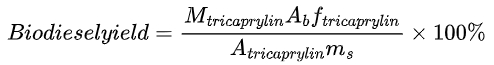 參考材料和樣品通過配備火焰離子化檢測(cè)器(FID)和HP - 5毛細(xì)管柱(30m×0.32mm×0.25μm)的7890A氣相色譜儀(Agilent Technology Inc. USA)進(jìn)行分析。氦氣用作載氣。烘箱溫度程序?yàn)?35℃保持10min,以10℃/min升溫至170℃,并保持10min,以25℃/min升溫至250℃,并保持2min。氫氣流量為30ml/min,空氣流量約為400ml/min。進(jìn)樣器和檢測(cè)器的溫度分別為280℃和300℃。進(jìn)樣采用分流模式,分流比為20:1。生物柴油的產(chǎn)率在三辛精作為內(nèi)標(biāo)物的存在下進(jìn)行定量。每個(gè)樣品的生物柴油分析是通過將1mL生物柴油樣品溶解在5mL正己烷中,并在上述相同條件下注入0.5μL該溶液進(jìn)行GC分析。生物柴油的產(chǎn)率根據(jù)GC分析的甲基酯含量通過以下公式計(jì)算: