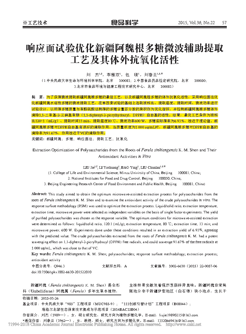 這篇由中央民族大學(xué)生命與環(huán)境科學(xué)學(xué)院的研究學(xué)者完成,討論響應(yīng)面試驗(yàn)優(yōu)化新疆阿魏根多糖微波輔助提取工藝及其體外抗氧化活性的論文,發(fā)表在重要期刊《食品科學(xué)》上。