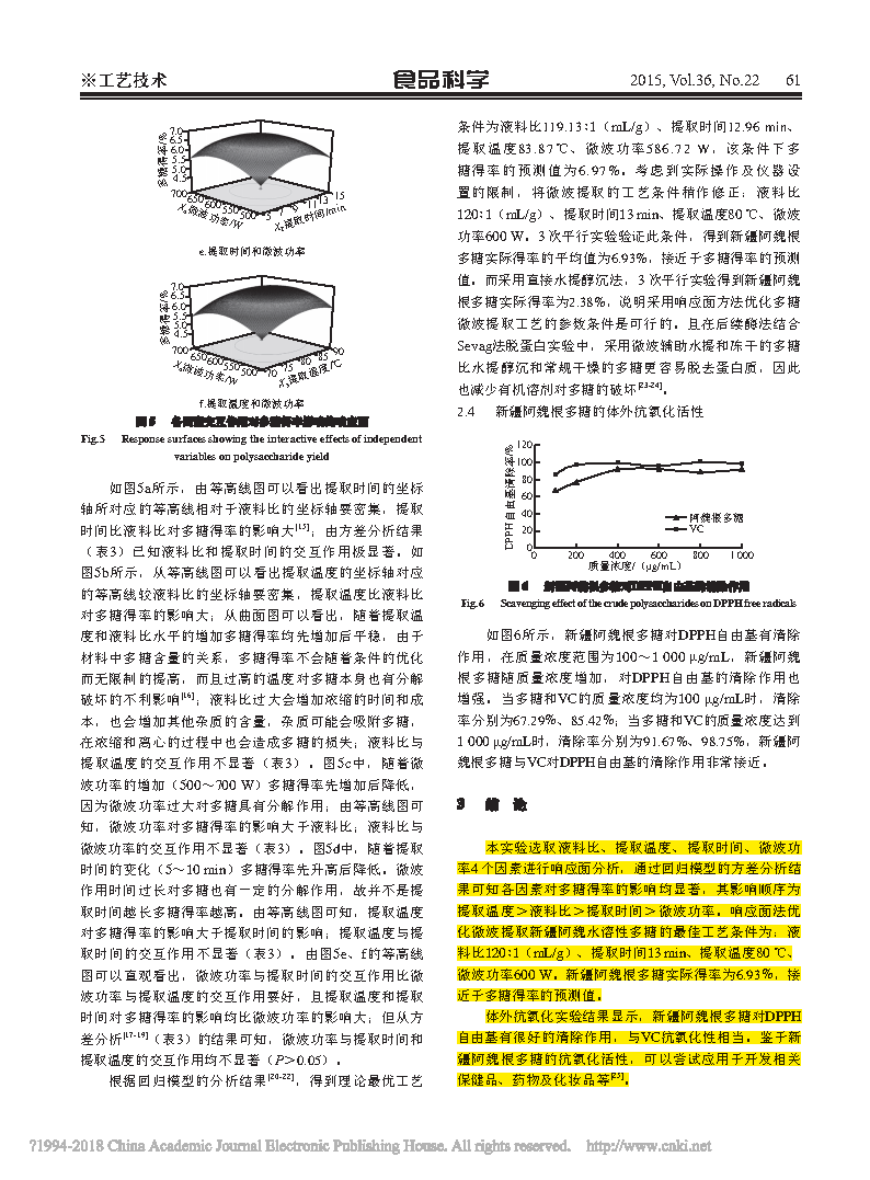 本實(shí)驗(yàn)選取液料比、提取溫度、提取時(shí)間、微波功率4 個(gè)因素進(jìn)行響應(yīng)面分析,通過(guò)回歸模型的方差分析結(jié)果可知各因素對(duì)多糖得率的影響均顯著,其影響順序?yàn)樘崛囟龋疽毫媳龋咎崛r(shí)間>微波功率。響應(yīng)面法優(yōu)化微波提取新疆阿魏水溶性多糖的最佳工藝條件為:液料比120∶1(mL/g)、提取時(shí)間13 min、提取溫度80 ℃、微波功率600 W。新疆阿魏根多糖實(shí)際得率為6.93%,接近于多糖得率的預(yù)測(cè)值。體外抗氧化實(shí)驗(yàn)結(jié)果顯示,新疆阿魏根多糖對(duì)DPPH 自由基有很好的清除作用,與VC抗氧化性相當(dāng)。鑒于新疆阿魏根多糖的抗氧化活性,可以嘗試應(yīng)用于開發(fā)相關(guān)保健品、藥物及化妝品等[25]。