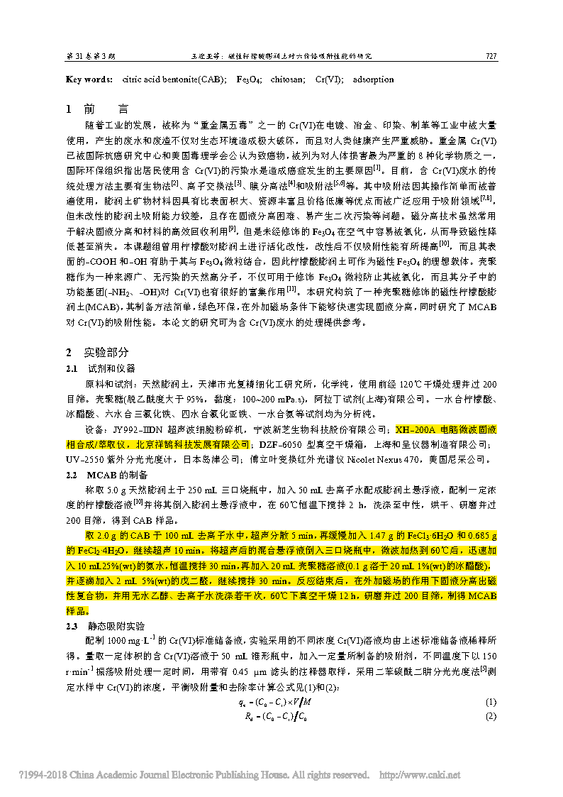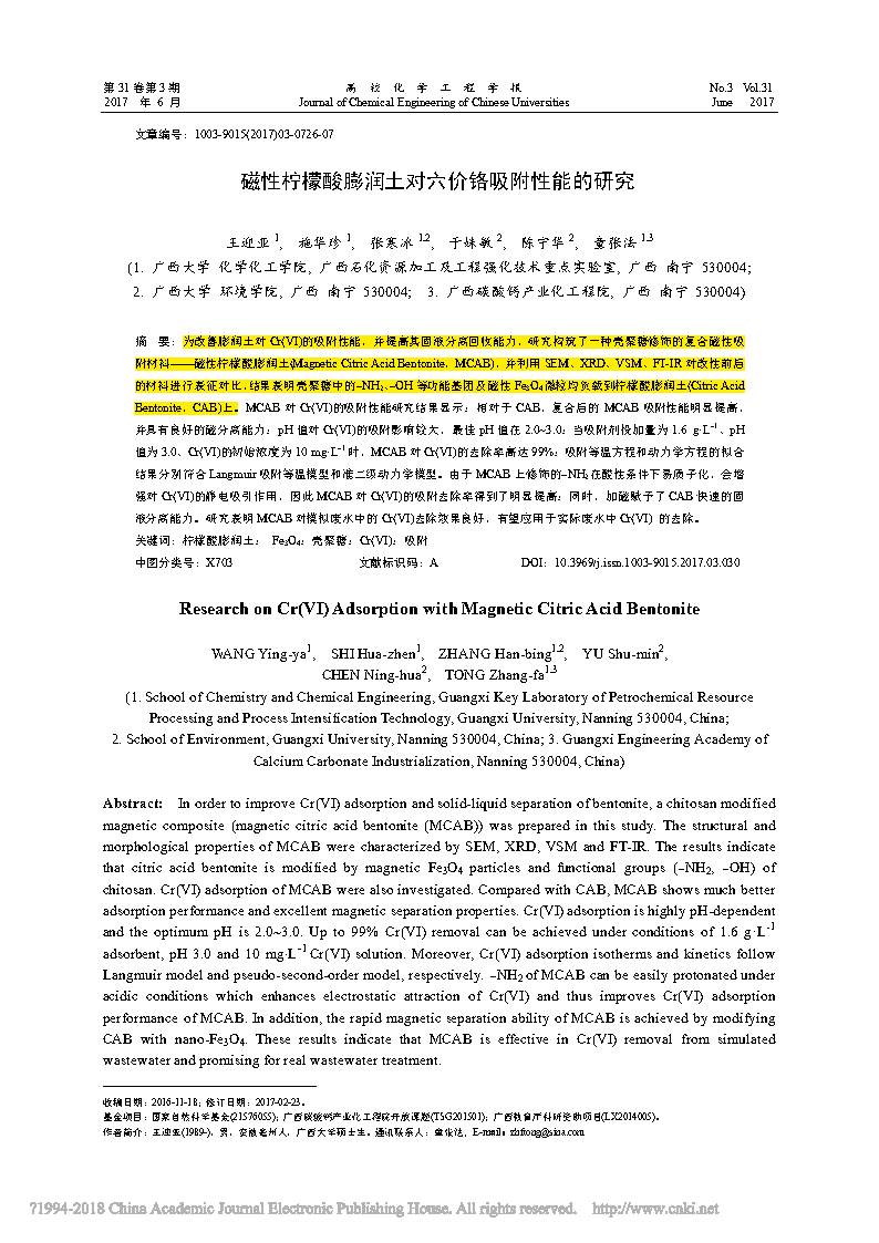 這篇由廣西大學(xué)化學(xué)化工學(xué)院的研究學(xué)者完成,討論磁性檸檬酸膨潤土對(duì)六價(jià)鉻吸附性能研究的論文,發(fā)表在重要期刊《高校化學(xué)工程學(xué)報(bào)》上。