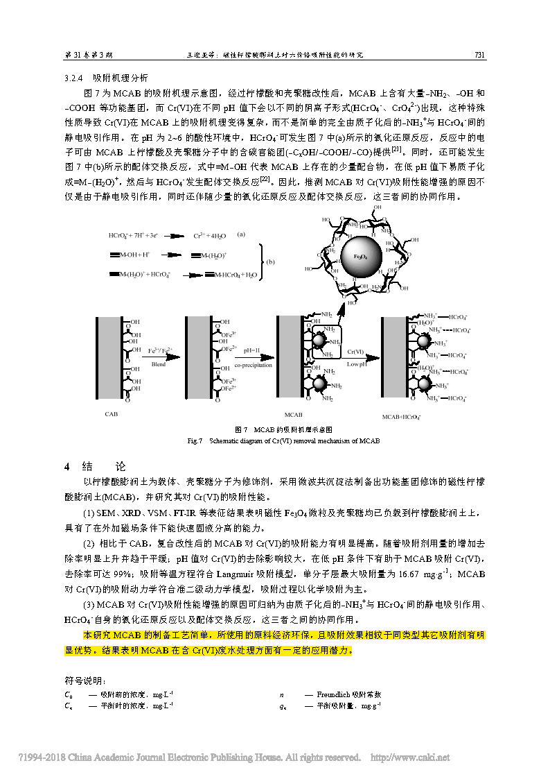 以檸檬酸膨潤土為載體、殼聚糖分子為修飾劑,采用微波共沉淀法制備出功能基團(tuán)修飾的磁性檸檬酸膨潤土(MCAB),并研究其對(duì)Cr(VI)的吸附性能。(1) SEM、XRD、VSM、FT-IR 等表征結(jié)果表明磁性 Fe3O4 微粒及殼聚糖均已負(fù)載到檸檬酸膨潤土上,具有了在外加磁場條件下能快速固液分離的能力。(2) 相比于 CAB,復(fù)合改性后的 MCAB 對(duì) Cr(VI)的吸附能力有明顯提高。隨著吸附劑用量的增加去 除率明顯上升并趨于平緩;pH 值對(duì) Cr(VI)的去除影響較大,在低 pH 條件下有助于 MCAB 吸附 Cr(VI),去除率可達(dá) 99%;吸附等溫方程符合 Langmuir 吸附模型,單分子層最大吸附量為 16.67 mg×g?1;MCAB 對(duì) Cr(VI)的吸附動(dòng)力學(xué)符合準(zhǔn)二級(jí)動(dòng)力學(xué)模型,吸附過程以化學(xué)吸附為主。(3) MCAB 對(duì) Cr(VI)吸附性能增強(qiáng)的原因可歸納為由質(zhì)子化后的?NH3+與 HCrO4?間的靜電吸引作用、HCrO4?自身的氧化還原反應(yīng)以及配體交換反應(yīng),這三者之間的協(xié)同作用。本研究 MCAB 的制備工藝簡單,所使用的原料經(jīng)濟(jì)環(huán)保,且吸附效果相較于同類型其它吸附劑有明顯優(yōu)勢。結(jié)果表明 MCAB 在含 Cr(VI)廢水處理方面有一定的應(yīng)用潛力。
