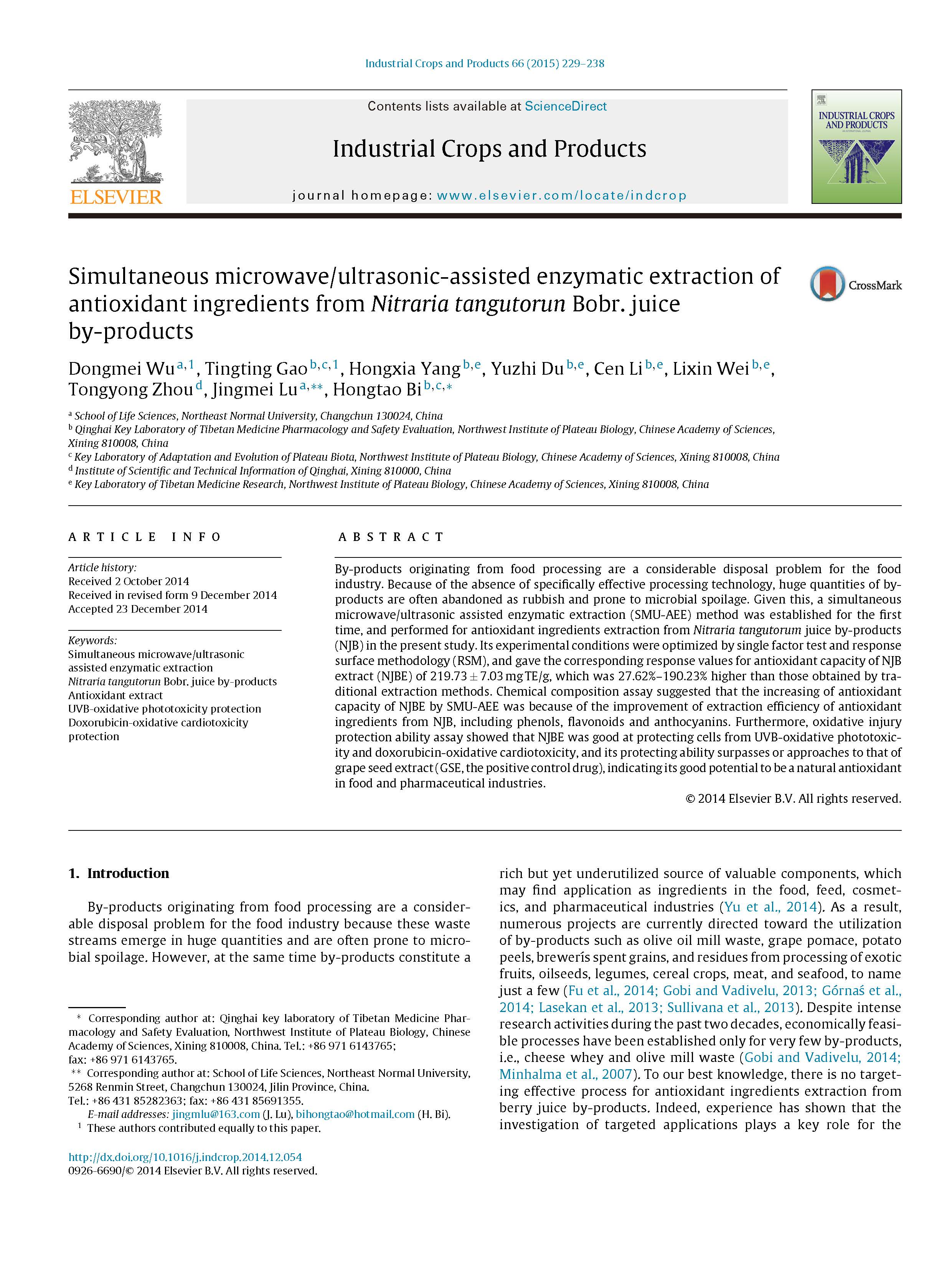 這篇由東北師范大學(xué)等的研究學(xué)者完成,討論同時微波/超聲波輔助酶法提取Nitraria tangutorun Bobr.果汁副產(chǎn)品的抗氧化成分的論文,發(fā)表在一區(qū)重要期刊《Industrial Crops and Products》,影響因子:3.849。