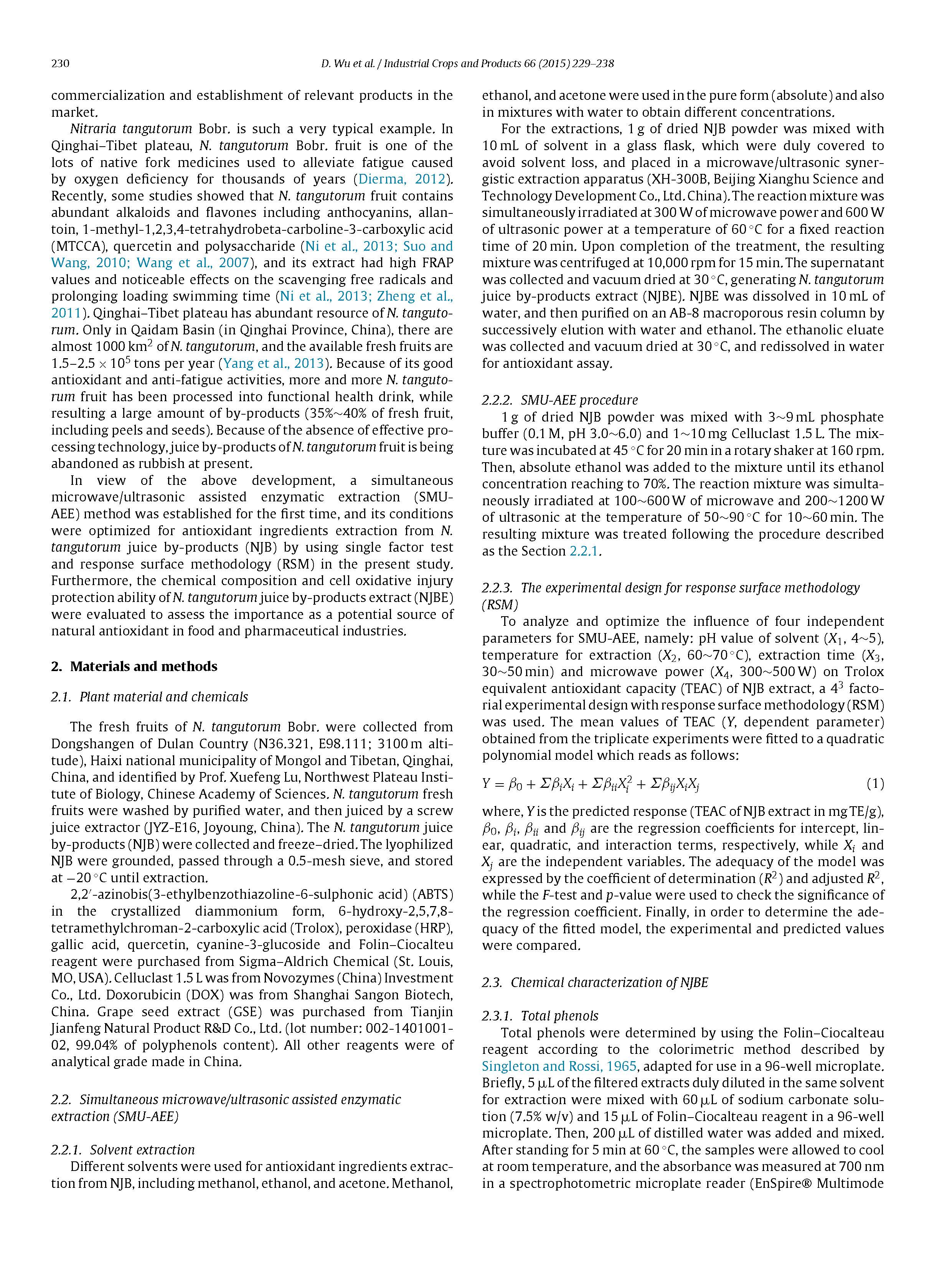 源自食品加工的副產(chǎn)品對食品工業(yè)來說是一個相當(dāng)大的處置問題.由于缺乏具體有效的處理技術(shù),大量的副產(chǎn)品往往被廢棄為垃圾,容易發(fā)生微生物腐敗。在此基礎(chǔ)上,首次建立了微波/超聲輔助酶法(SMU-AEE),并對白刺果汁副產(chǎn)物(NJB)中的抗氧化成分進(jìn)行了提取。