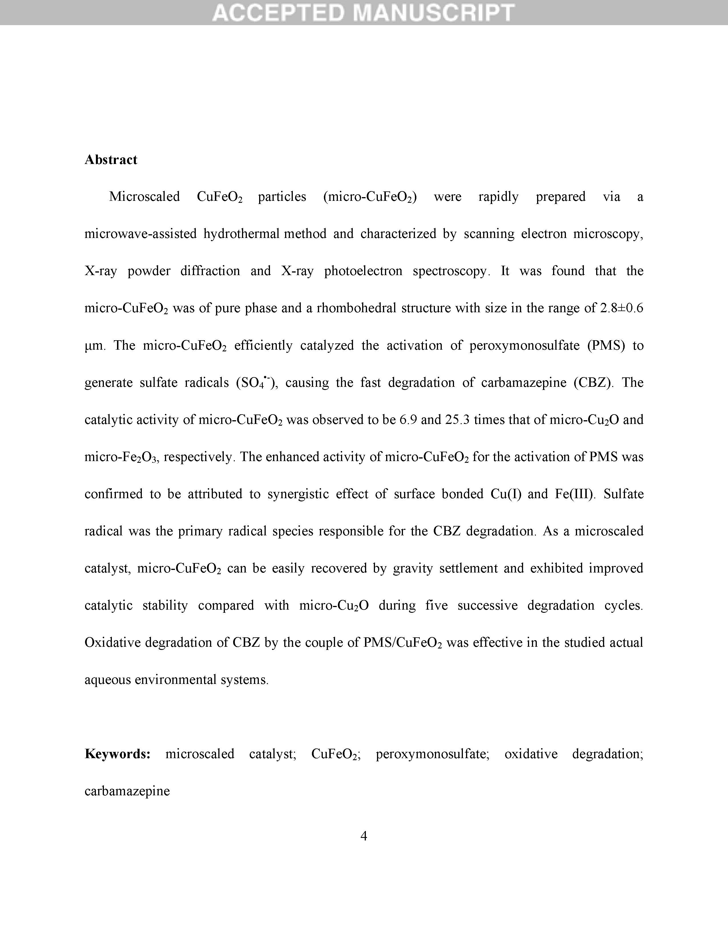 微CuFeO 2有效地催化了過氧單硫酸鹽(PMS)的活化,生成硫酸根(SO4·-),導致卡馬西平(CBZ)的快速降解。微CuFeO 2的催化活性分別是微Cu2O和微量Fe2O3的6.9倍和25.3倍,微CuFeO 2對PMS活性的增強是由于表面結合Cu(I)和Fe(III)的協(xié)同作用所致。