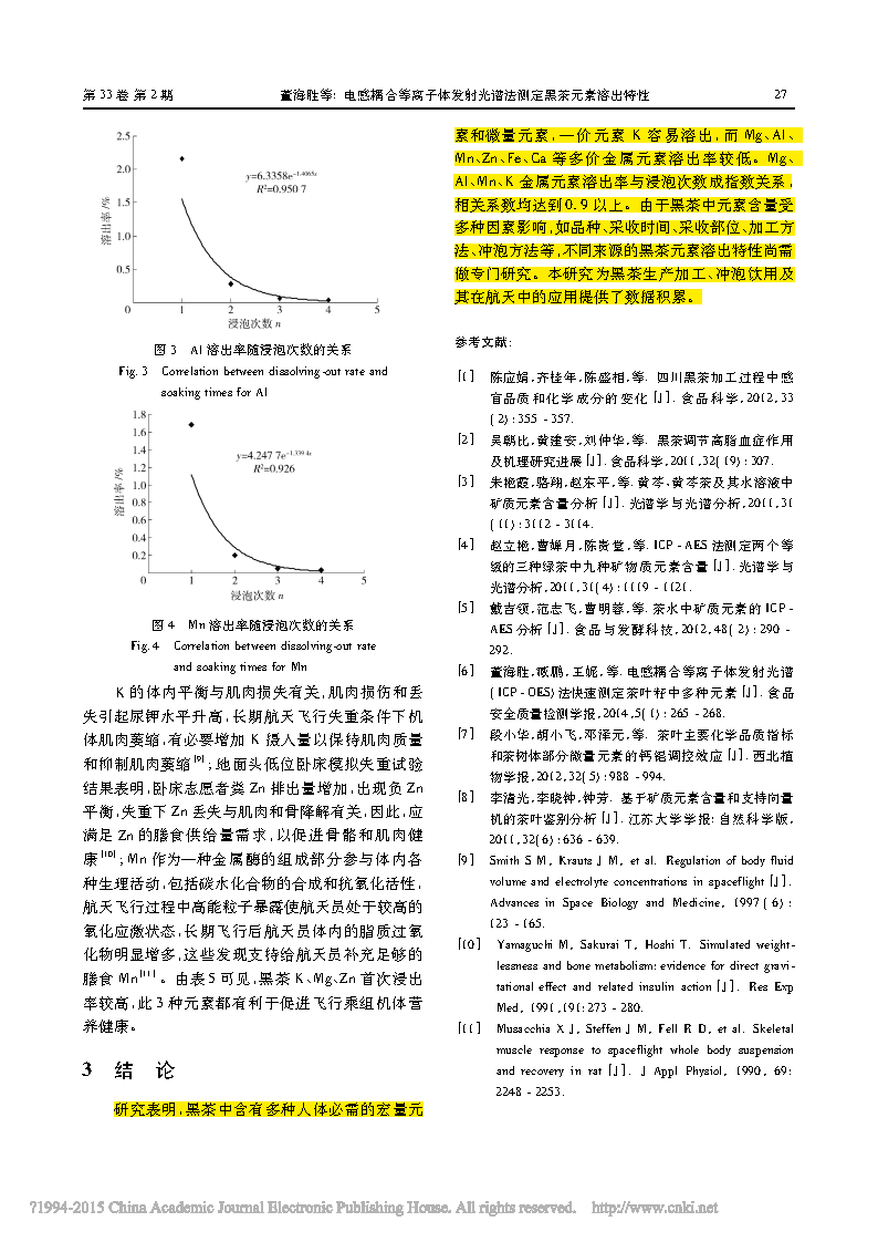 研究表明,黑茶中含有多種人體必需的宏量元素和微量元素,一價(jià)元素 K容易溶出,而Mg、Al、Mn、Zn、Fe、Ca 等多價(jià)金屬元素溶出率較低。Mg、Al、Mn、K 金屬元素溶出率與浸泡次數(shù)成指數(shù)關(guān)系,相關(guān)系數(shù)均達(dá)到 0. 9 以上。由于黑茶中元素含量受多種因素影響,如品種、采收時(shí)間、采收部位、加工方法、沖泡方法等,不同來(lái)源的黑茶元素溶出特性尚需做專(zhuān)門(mén)研究。本研究為黑茶生產(chǎn)加工、沖泡飲用及其在航天中的應(yīng)用提供了數(shù)據(jù)積累。