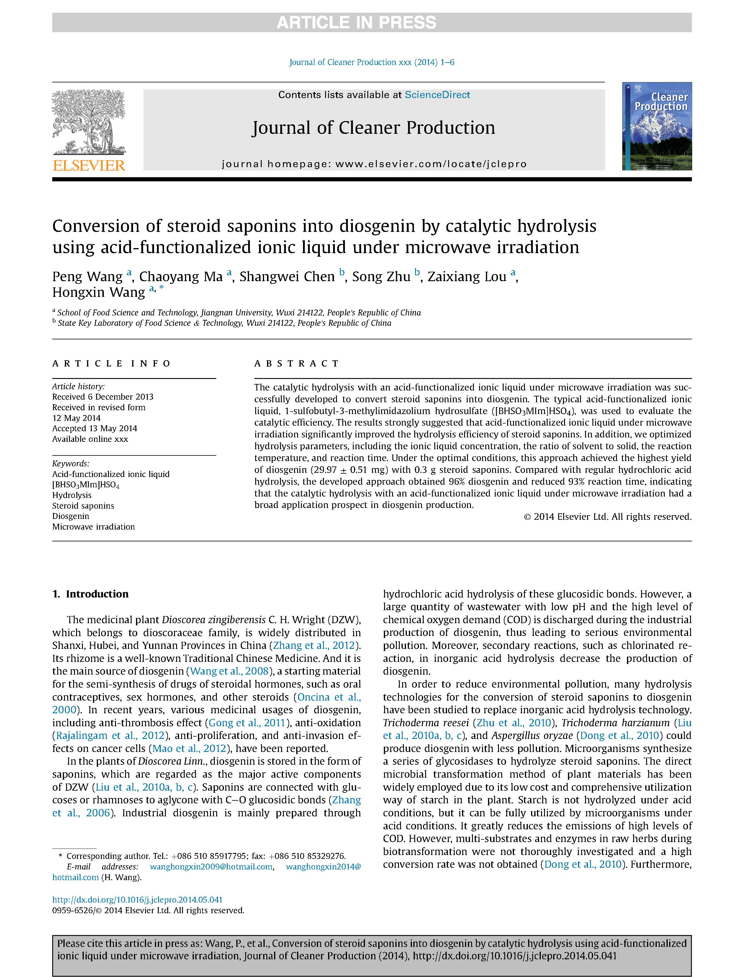 這篇由江南大學(xué)等的研究學(xué)者完成,討論在微波輻射下使用酸官能化離子液體通過催化水解將類固醇皂苷轉(zhuǎn)化為皂苷元的論文,發(fā)表在一區(qū)重要期刊《Journal of Cleaner Production》,影響因子:5.651。
