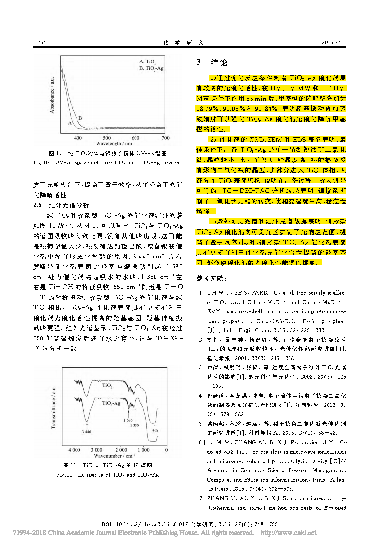 1)通過(guò)優(yōu)化反應(yīng)條件制備 TiO2-Ag催 化劑具有較高的光催化活性,在 UV、UV-MW 和 UT-UV- MW 條件下作用55min后,甲基橙的降解率分別為 98.79%、99.05%和99.84%,表明超聲振動(dòng)再加微波輻射可以強(qiáng)化TiO2-Ag催 化劑光催化降解甲基橙的活性. 2)催化劑的 XRD、SEM 和 EDS表征表明,最 佳條件下制備 TiO2-Ag是單一晶型銳鈦礦二氧化鈦,晶粒較小、比表面積大、結(jié)晶度高.銀的摻雜沒(méi)有影響二氧化鈦的晶型,少部分進(jìn)入 TiO2體相,大部分在TiO2表面沉積,說(shuō)明在制備過(guò)程中摻入銀是可行的.TG-DSC-TAG 分 析結(jié)果表明,銀摻雜抑制了二氧化鈦晶相的轉(zhuǎn)變,使相變溫度升高,穩(wěn)定性增強(qiáng). 3)紫外可見(jiàn)光譜和紅外光譜數(shù)據(jù)表明,銀摻雜 TiO2-Ag催化劑向可見(jiàn)光區(qū)擴(kuò)寬了光響應(yīng)范圍,提高了量子效率;同時(shí),銀摻雜TiO2-Ag催化劑表面具有更多有利于催化劑光催化活性提高的羥基基團(tuán),都會(huì)使催化劑的光催化性能得以提高.
